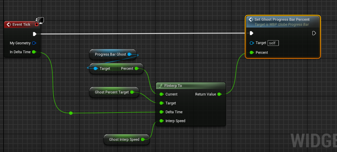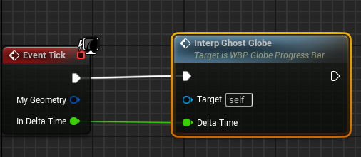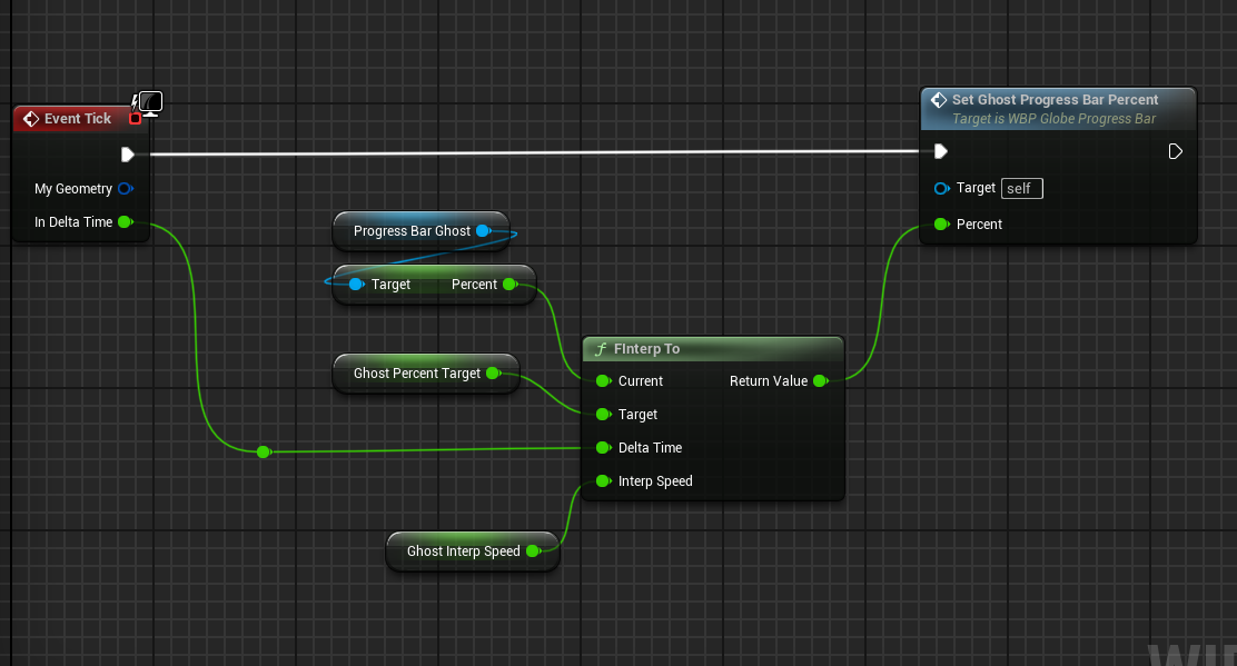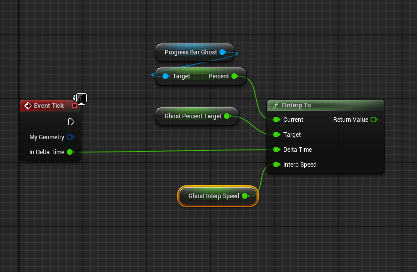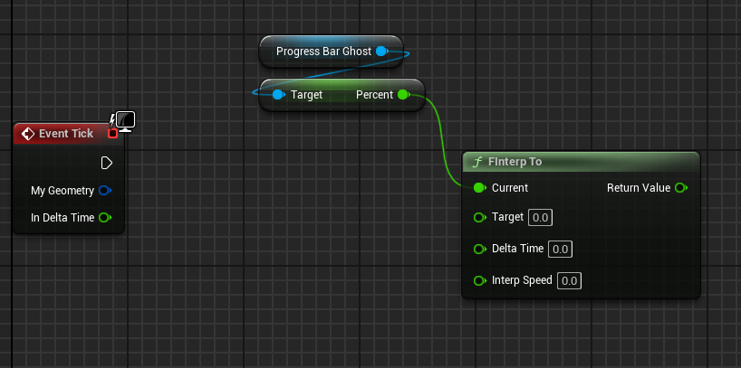 Event Tick 노드를 생성하고 보간을 위한 FInterp To 노드를 생성한 다음, ProgressBarGhost 의 퍼센트를 Current 핀과 연결시킨다.