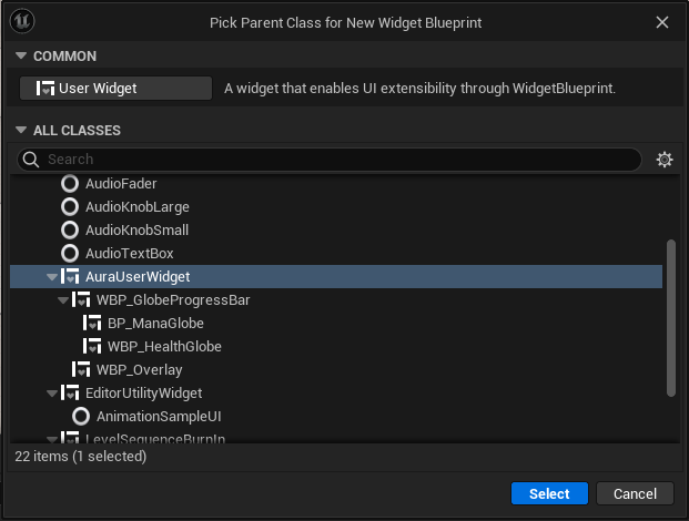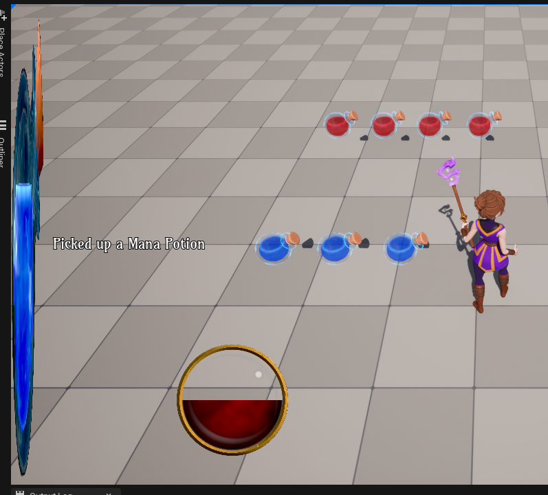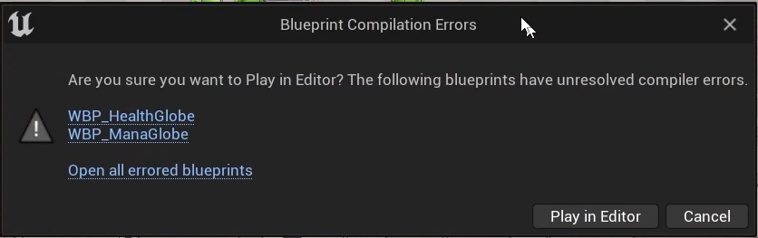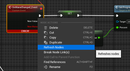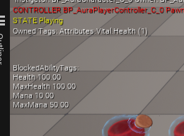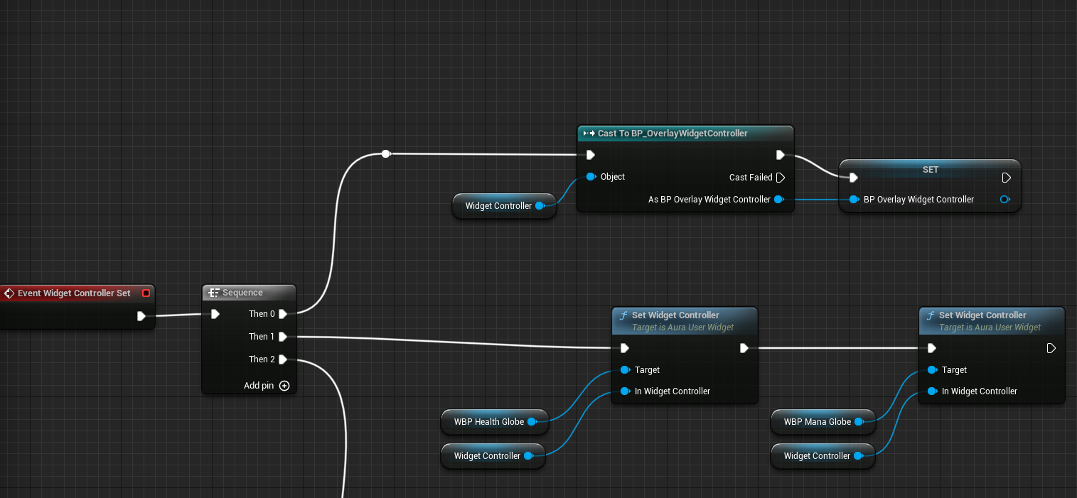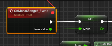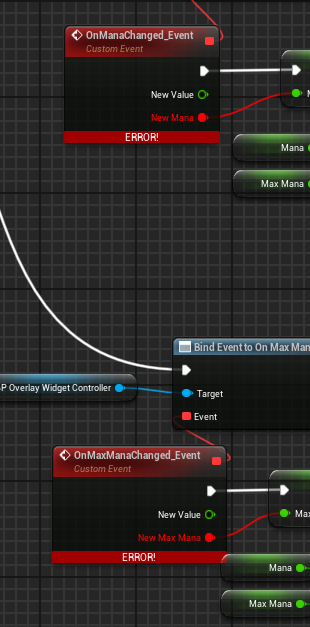 // OverlayWidgetController.cpp ... void UOverlayWidgetController::BindCallbacksToDependencies() { const UAuraAttributeSet* AuraAttributeSet = CastChecked<UAuraAttributeSet>(AttributeSet); AbilitySystemComponent->GetGameplayAttributeValueChangeDelegate(AuraAttributeSet->GetHealthAttribute()).AddLambda( [this](const FOnAttributeChangeData& Data) { OnHealthChanged.Broadcast(Data.NewValue); } ); AbilitySystemComponent->GetGameplayAttributeValueChangeDelegate(AuraAttributeSet->GetMaxHealthAttribute()).AddLambda( [this](const FOnAttributeChangeData& Data) { OnMaxHealthChanged.Broadcast(Data.NewValue); } ); AbilitySystemComponent->GetGameplayAttributeValueChangeDelegate(AuraAttributeSet->GetManaAttribute()).AddLambda( [this](const FOnAttributeChangeData& Data) { OnManaChanged.Broadcast(Data.NewValue); } ); AbilitySystemComponent->GetGameplayAttributeValueChangeDelegate(AuraAttributeSet->GetMaxManaAttribute()).AddLambda( [this](const FOnAttributeChangeData& Data) { OnMaxManaChanged.Broadcast(Data.NewValue); } ); /** 헤더파일에 선언한 것들도 전부 삭제 */ // void UOverlayWidgetController::HealthChanged(const FOnAttributeChangeData& Data) const 삭제 // void UOverlayWidgetController::MaxHealthChanged(const FOnAttributeChangeData& Data) const 삭제 // void UOverlayWidgetController::ManaChanged(const FOnAttributeChangeData& Data) const 삭제 // void UOverlayWidgetController::MaxManaChanged(const FOnAttributeChangeData& Data) const 삭제 ...컴파일 후 실행하면 블루프린트 에러가 발생했다는 알람이 뜨는데