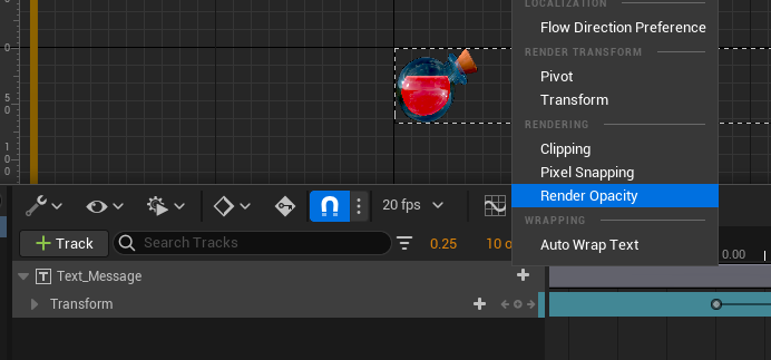 페이드아웃을 나타내기 위해 + -> Render Opacity 를 추가해주고, 0.8초에 0이 되도록 값을 지정해준다.