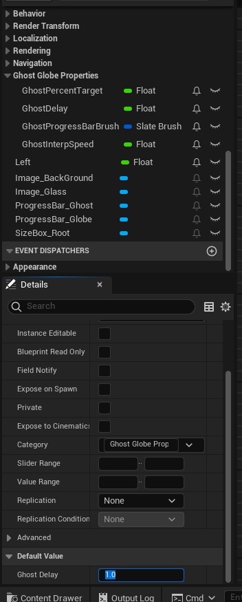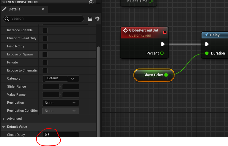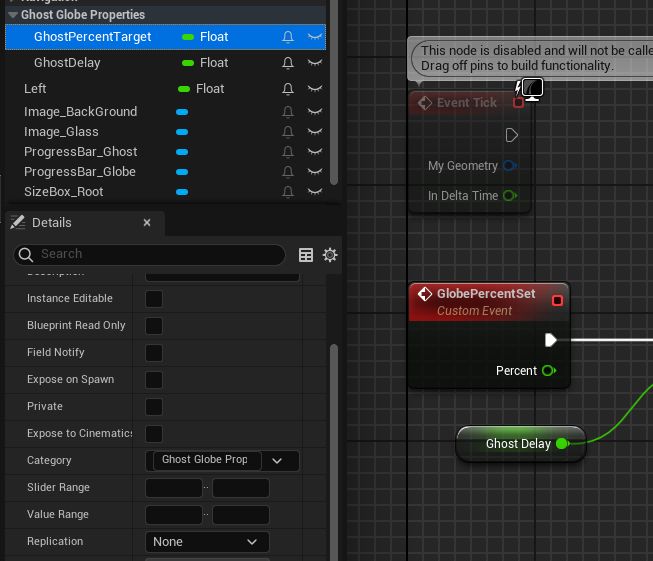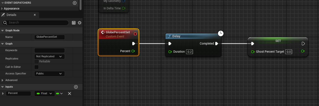 딜레이에 따라 GhostGlobe가 기존의 ProgressBar를 추적하여 따라가도록 딜레이를 발생시키는 커스텀 이벤트를 하나 생성하고, input을 하나 추가한다.