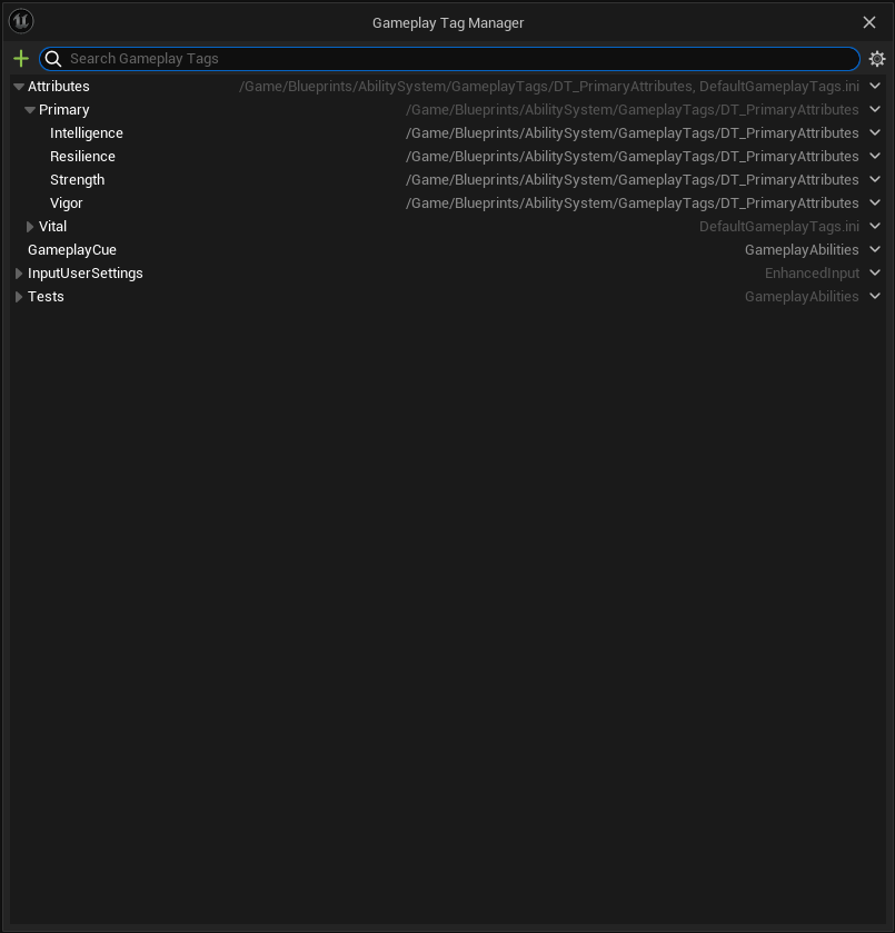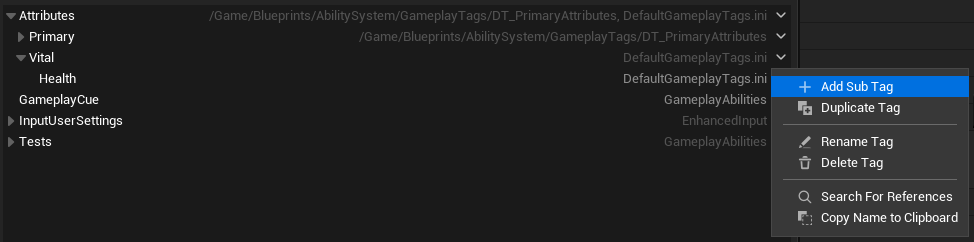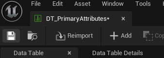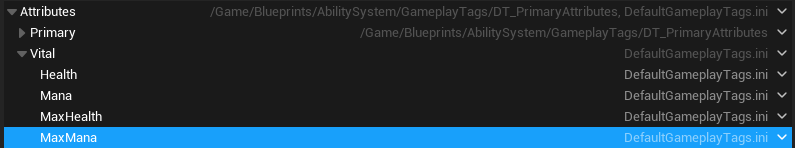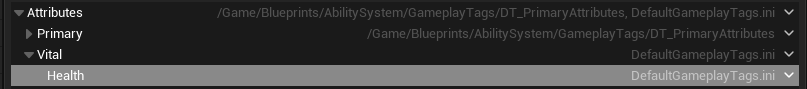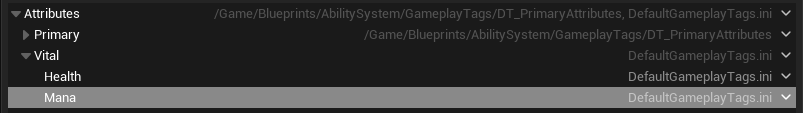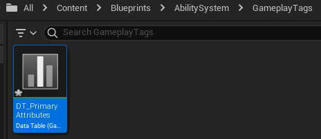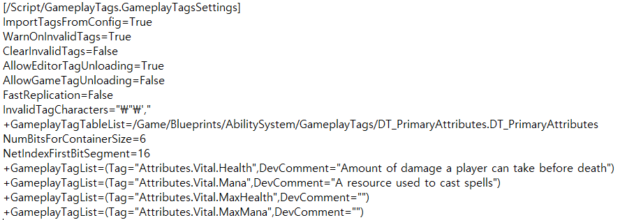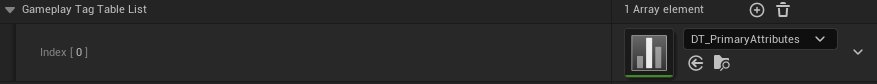 데이터 테이블을 통해 생성한 태그를 사용하기 위해서는 Project Settings -> GameplayTags -> Gameplay Tag Table List 에 방금 생성한 DT_PrimaryAttributes 를 추가해주어야 한다.