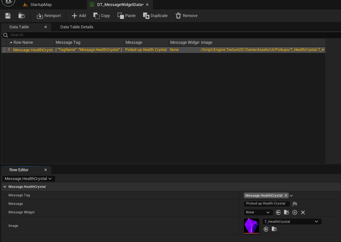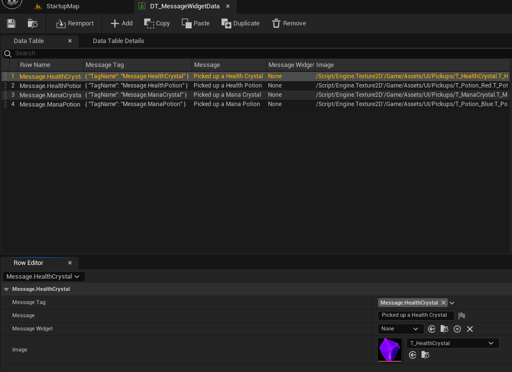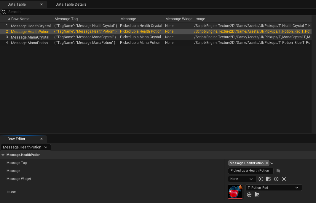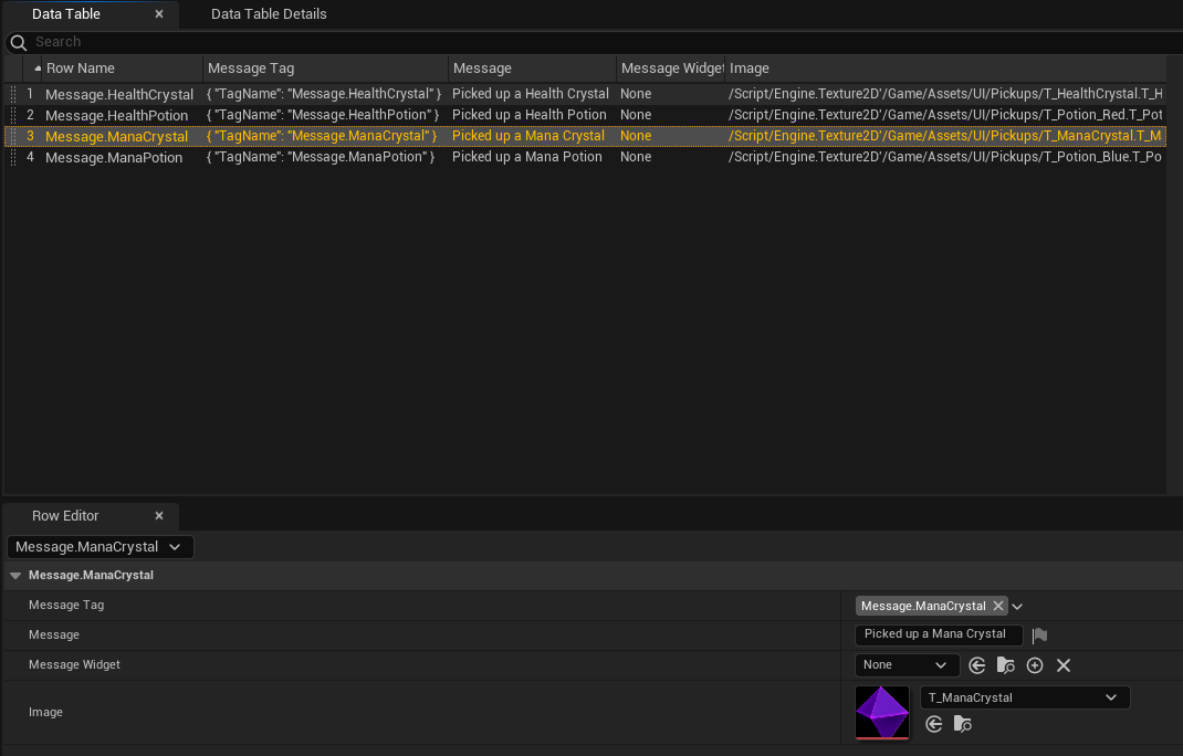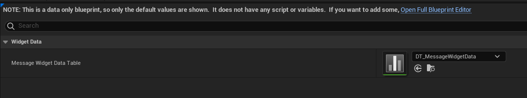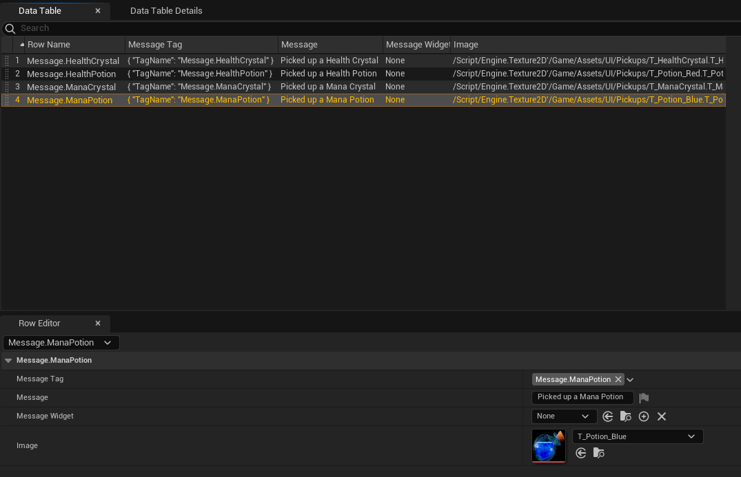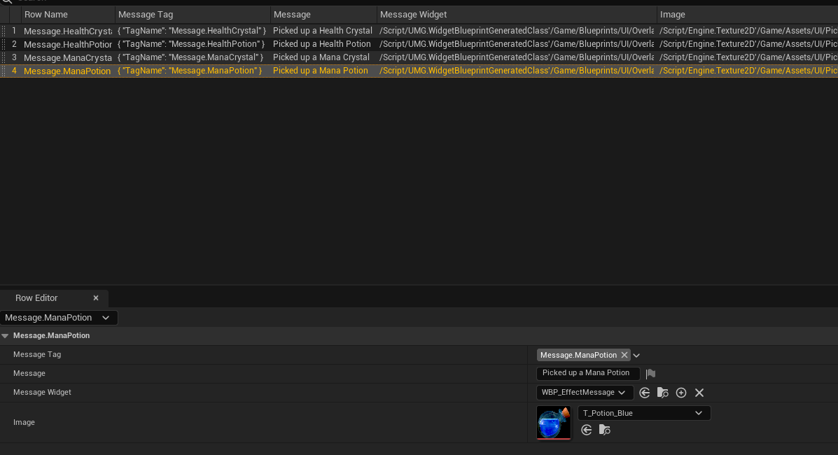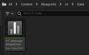 그전에 생성해둔 데이터테이블에서 비워둔 Message Widget 에 생성한 WBP_EffectMessage 를 추가해준다.