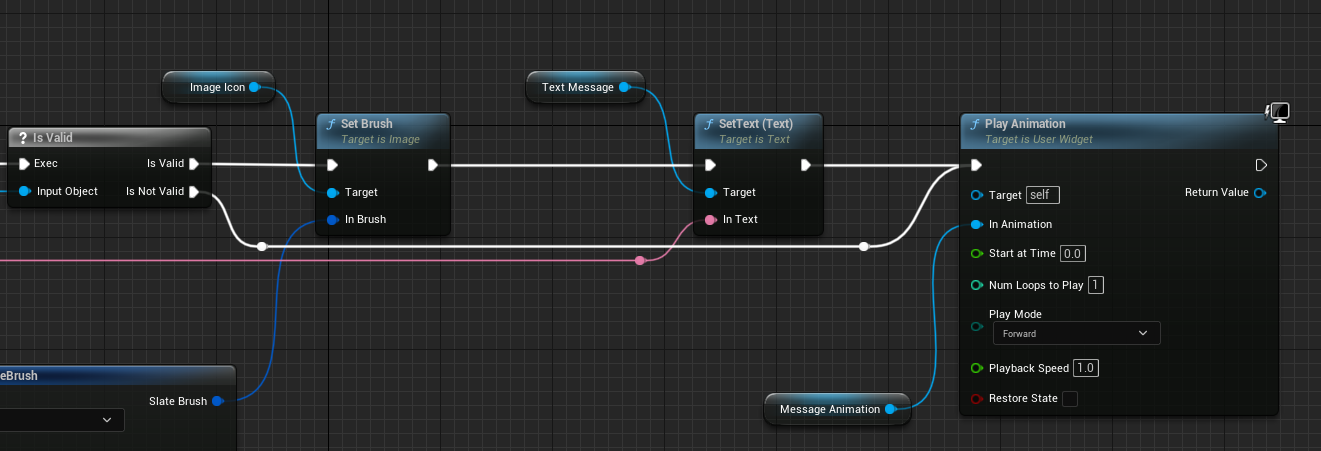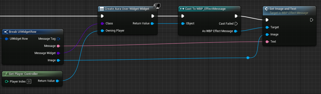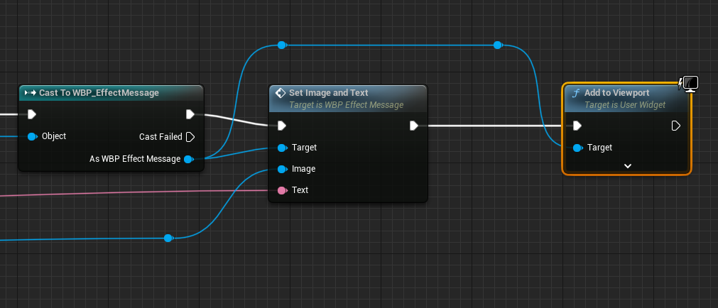 리턴값을 WBP_EffectMessage 로 캐스팅하고, WBP_EffectMessage 블루프린트 클래스에서 생성한 Set Image And Text 함수를 호출한 다음, Image 와 Message 를 연결한다.