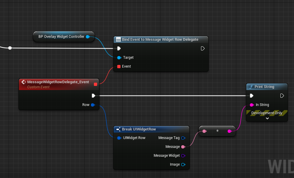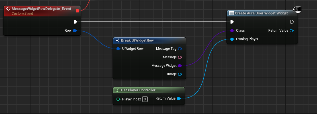 다시 WBP_Overlay 로 돌아와서 필요없는 문자열 출력 노드를 삭제하고, Create Widget 노드를 추가한 뒤 Get Player Controller 노드를 생성하여 Owner Player 핀과 연결하고, 생성할 위젯인 Message Widget 핀을 Class 핀과 연결한다.