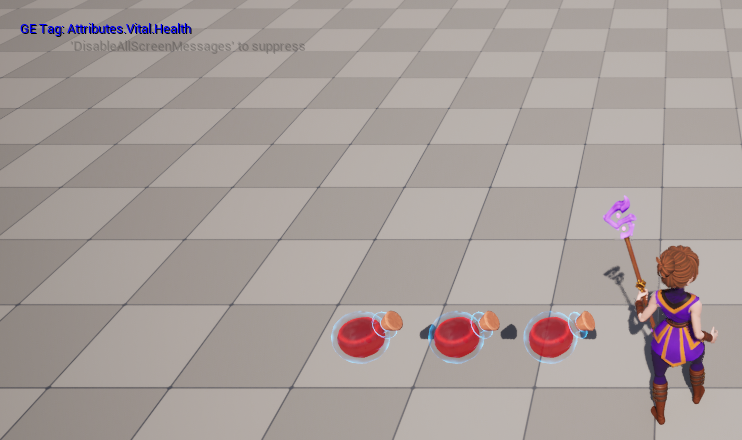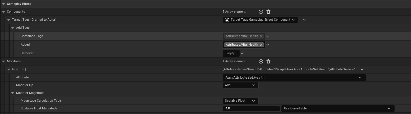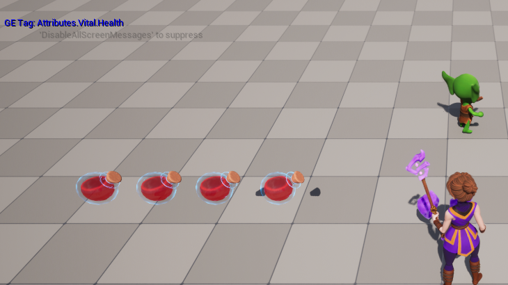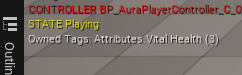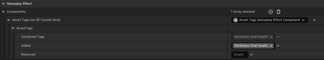 확인을 위해 GE_CrystalHeal 에서 Added : Attributes.Vital.Health , Scalable Float Magnitude : 4 (1로 하면 짧아서 확인하기 어려움)로 설정하고 실행하면 태그가 생기는 것을 확인할 수 있다.