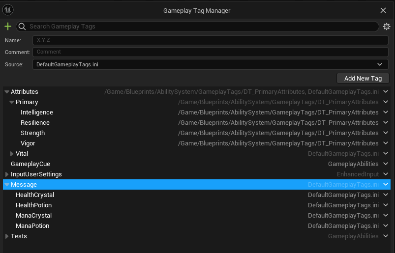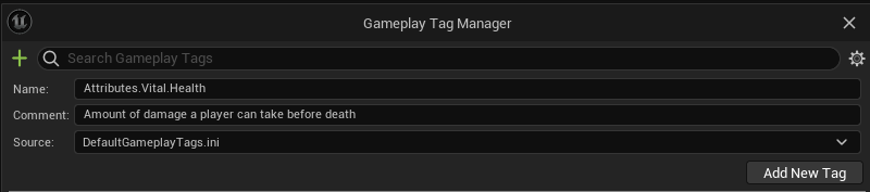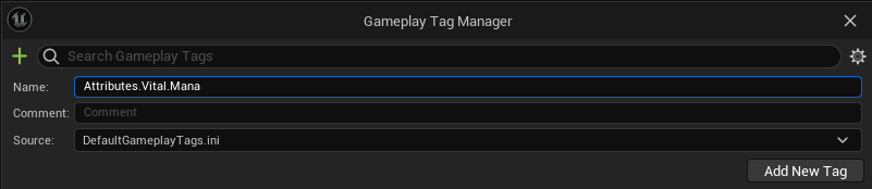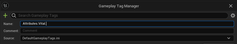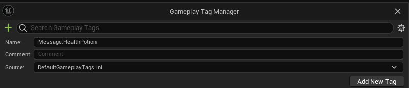 + 키를 누르고 Name과 Comment를 작성한 뒤, Source : DefaultGameplayTags.ini 로 설정하고 엔터를 누르면 GameplayTag 가 생성된다.(Primary탭은 6.3에서 진행)