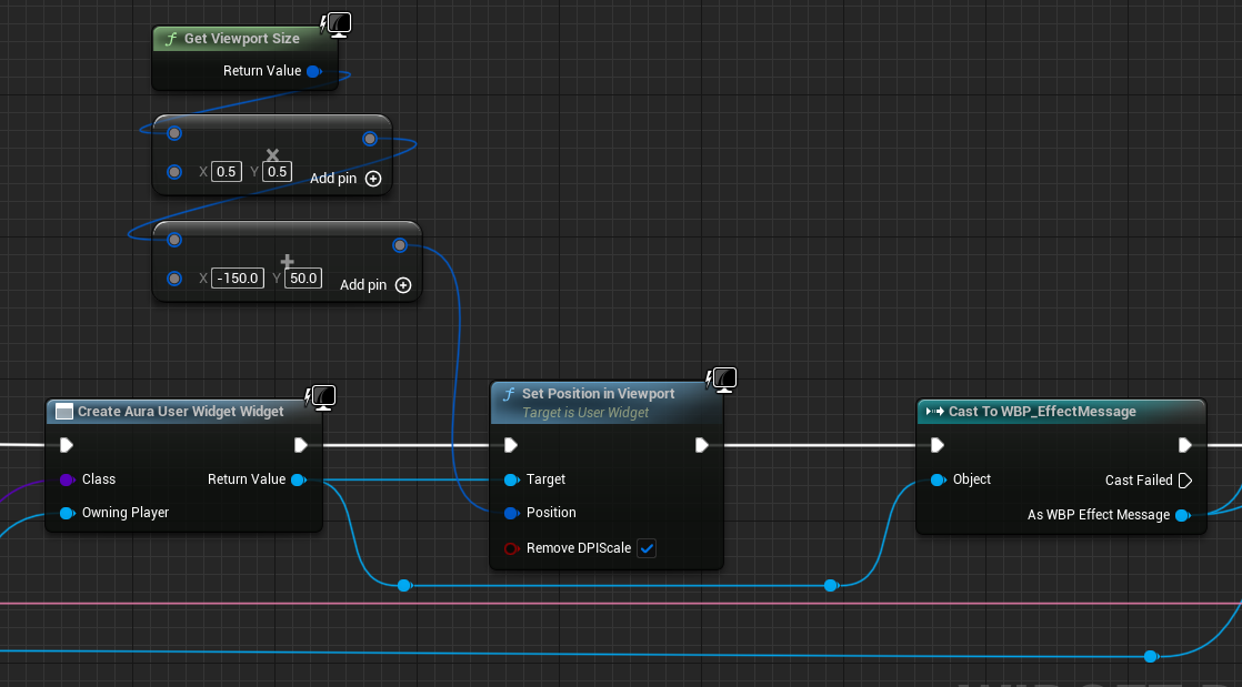 위젯의 위치를 변경하기 위해 다시 WBP_Overlay 로 돌아와서 생성한 위젯 핀에서 Set Position in Viewport 노드를 생성하여 연결한 다음, Get Viewport Size 노드를 통해 얻은 뷰포트 사이즈의 x, y 값에 0.5를 곱하고, 적당히 위치를 조절하여 화면 중앙에 출력되도록 수정한다.
