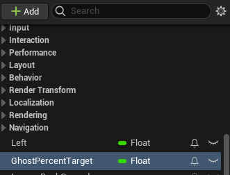 GhostPercentTarget 을 Target 핀과 연결시키고, Event Tick 노드로부터 DeltaTime 을 얻도록 한 후, Interp Speed 의 경우 변수로 승격시킨 다음 카테고리를 지정해주고 1로 초기화한다.