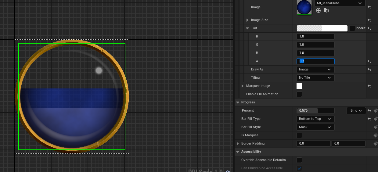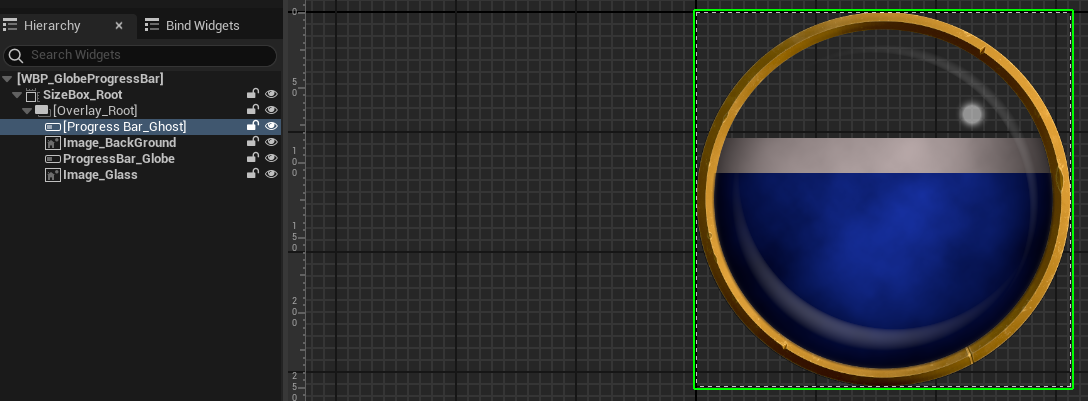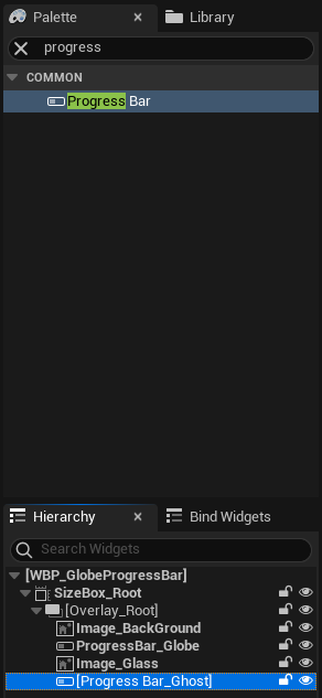 먼저 WBP_GlobeProgressBar 을 열고(HP, MP Globe의 부모 블루프린트 클래스) Progress Bar 를 추가한 뒤, ProgressBar_Ghost 로 명명한다.