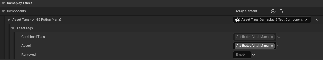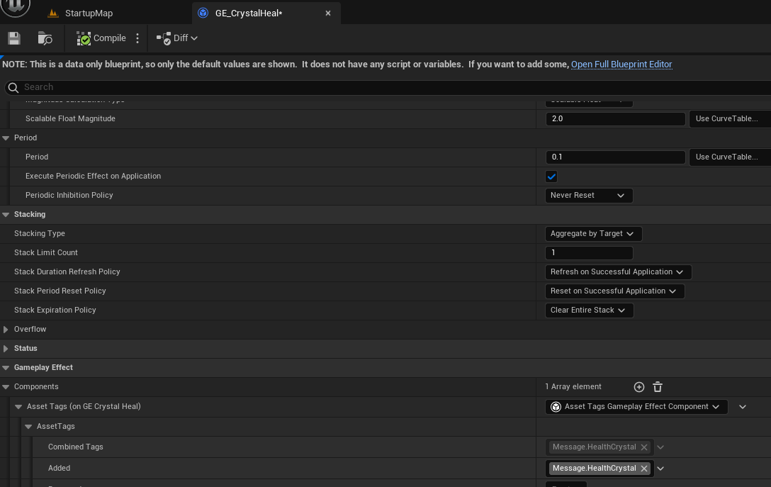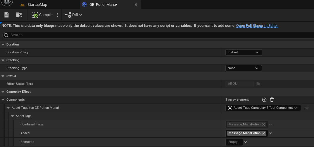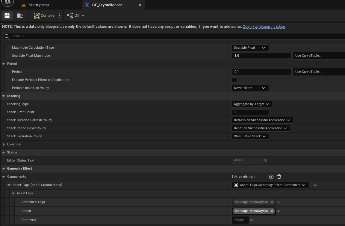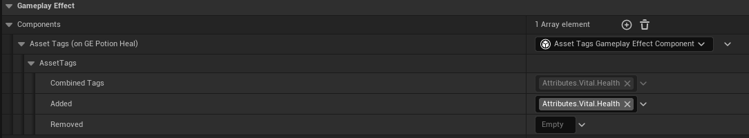 또한 스택이 적용된 GameplayEffect 가 여러번 적용될 경우 하나의 Tag만 발생하지만, 스택이 적용되지 않은 GameplayEffect 가 여러번 적용될 경우 여러 Tag가 발생한다.