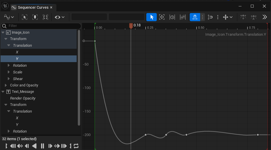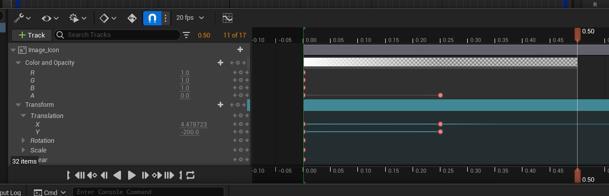 이미지의 경우 Color and Opacity 의 알파값을 수정하여 0.5초간 페이드아웃되도록 설정한다.