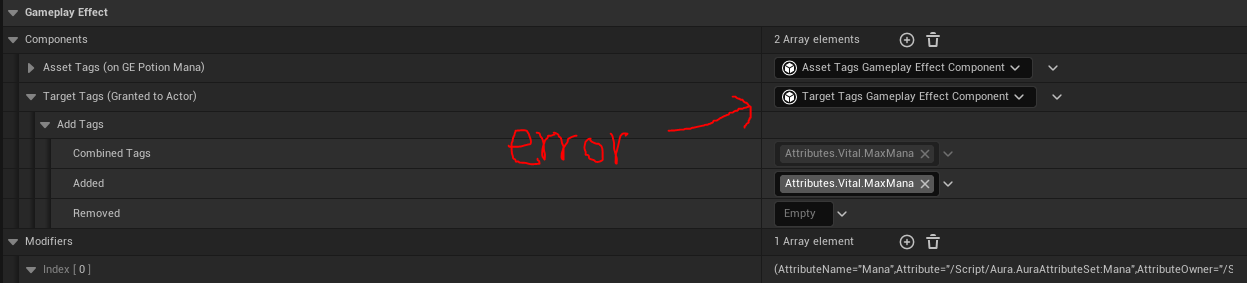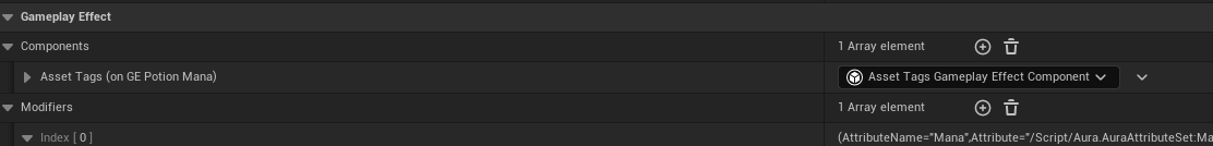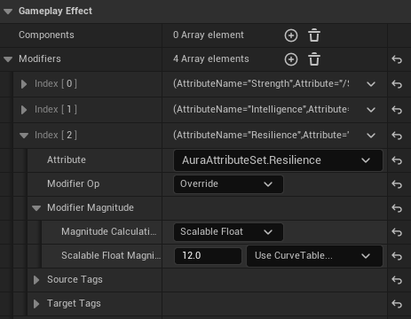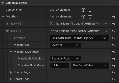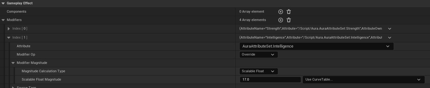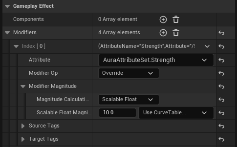 Gameplay Effect -> Modifiers 를 추가한 다음, Attribute : AuraAttributeSet.Strength , Modifier Op : Override , Scalable Float Magnitude : 10 으로 변경한다.