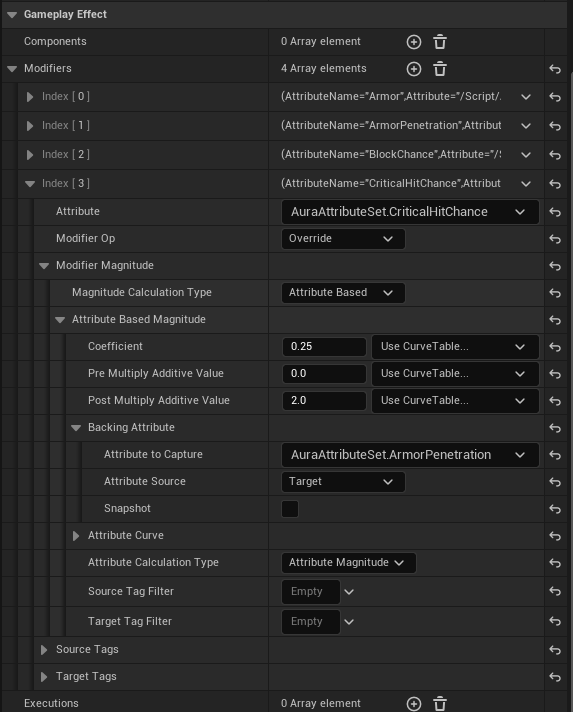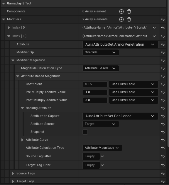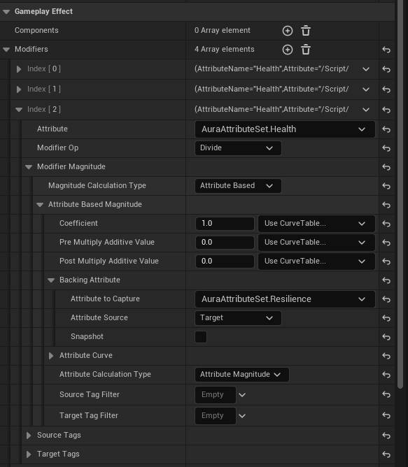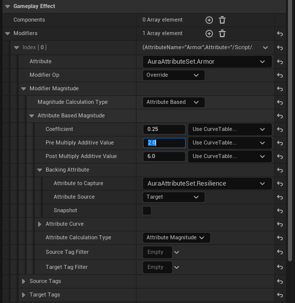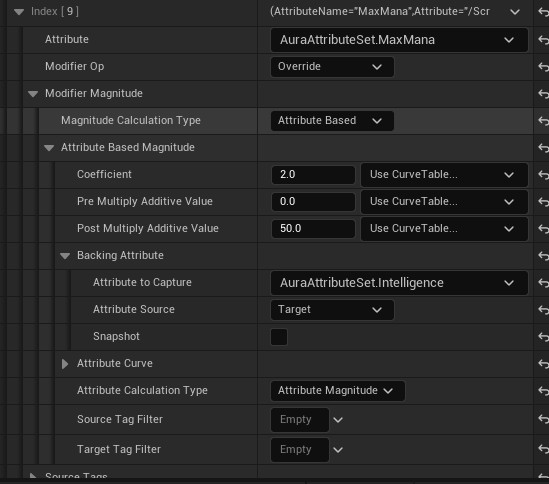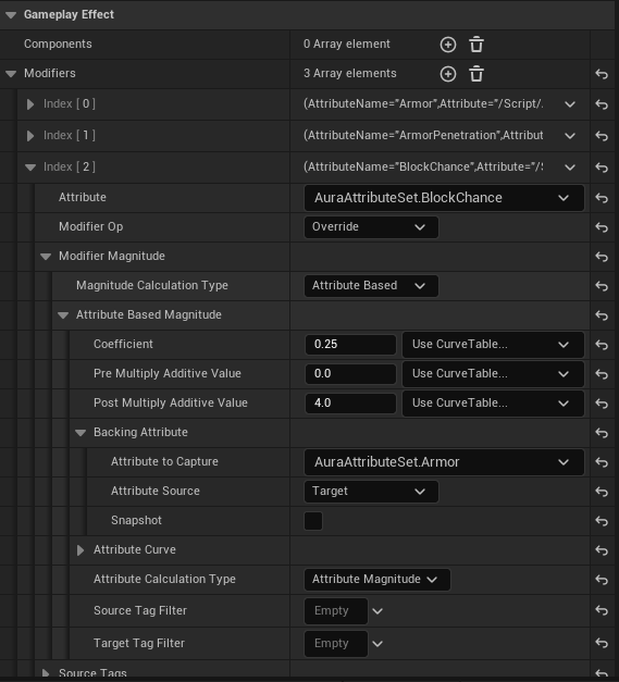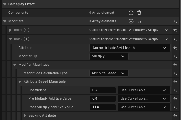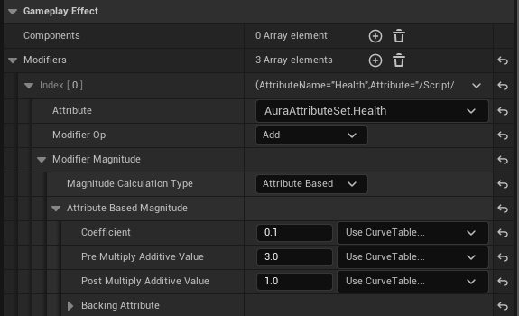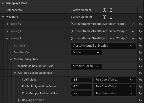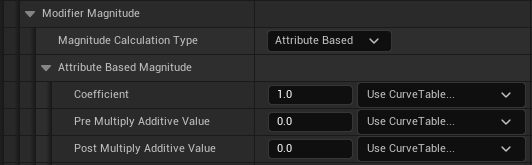 하지만 다른 GameplayEffect의 값을 통한 수정이 가능한데 바로 Attribute Based 옵션이다.