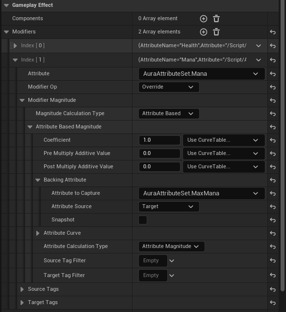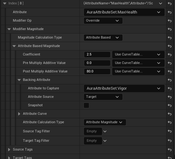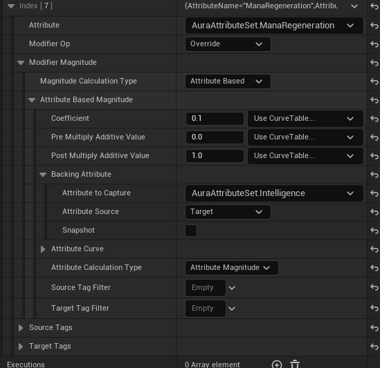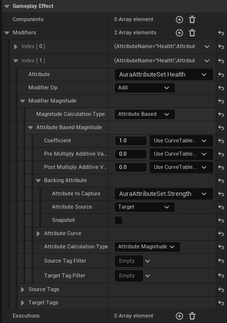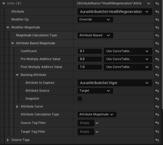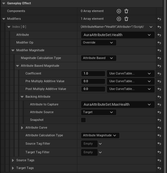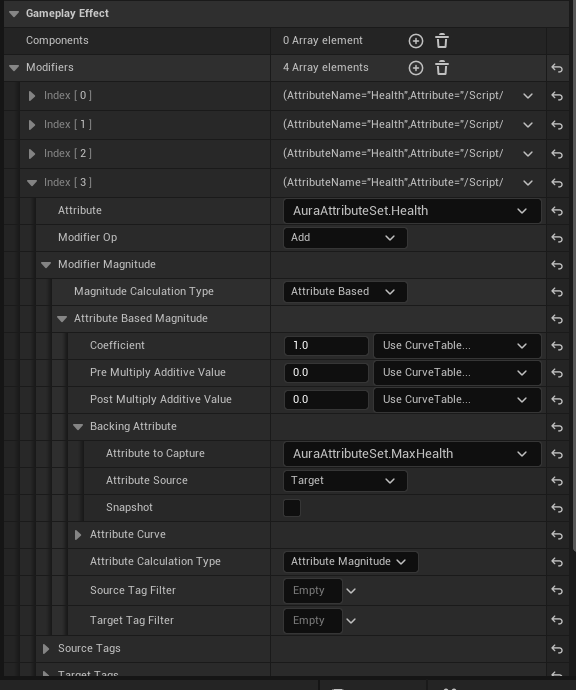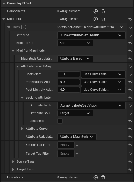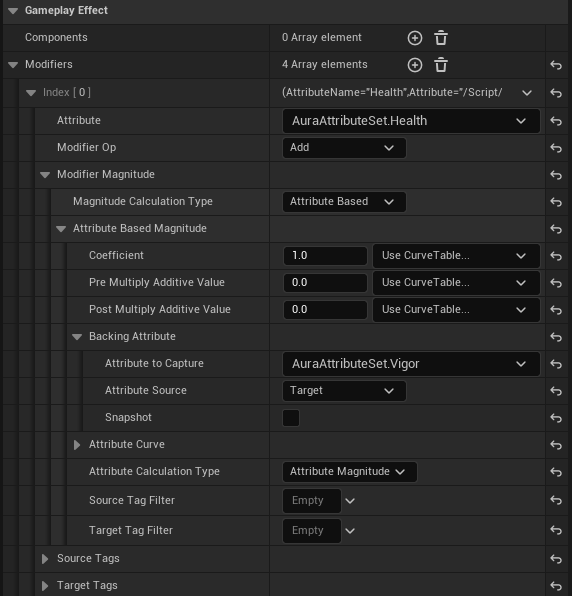 GE_TestAttributeBased 를 열고 Attribute : AuraAttributeSet.Health , Modifier Op : Add , Magitude Calcuation Type : Attribute Based , Backing Attribute -> Attribute to Capture : AuraAttributeSet.Vigor ,Attribute Source : Target 으로 설정해준다.