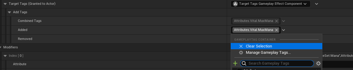 값 변화에 따른 수치 변화가 AttributeMenu 에도 적용되는지 확인하기 위해 GE_TestAttributeBased 를 열고 다른 모든 Modifiers 를 삭제한 다음 새로운 항목을 추가한다.