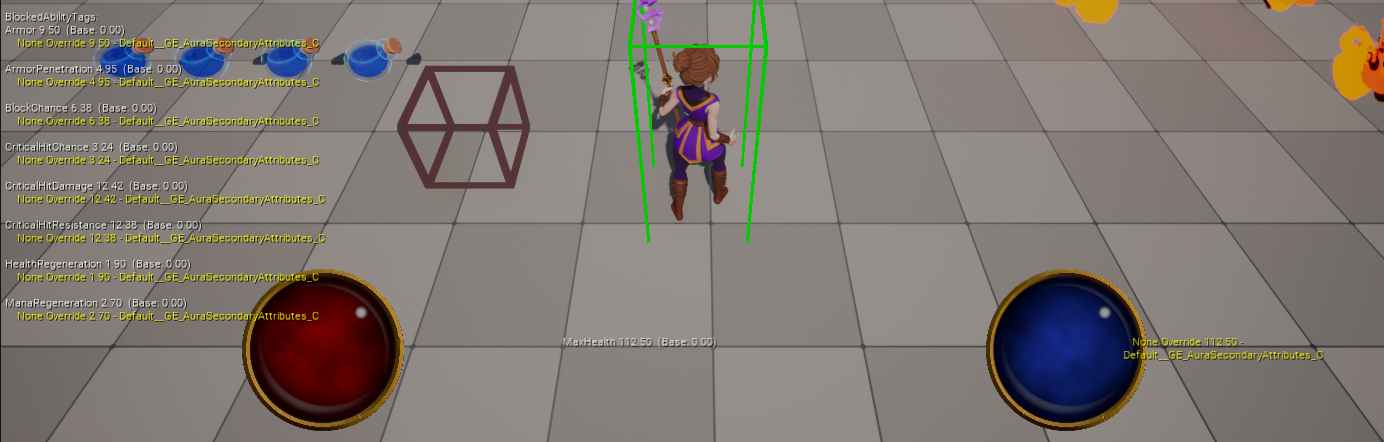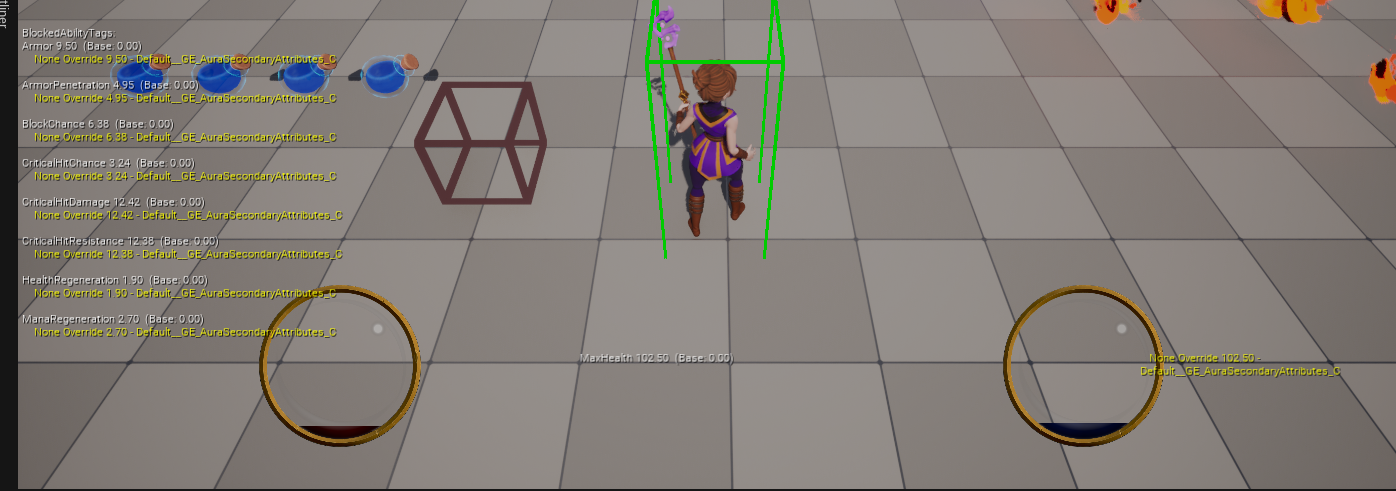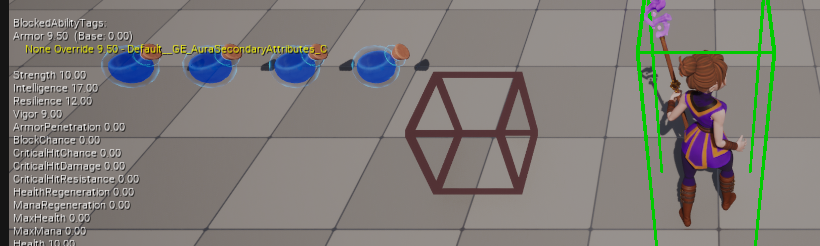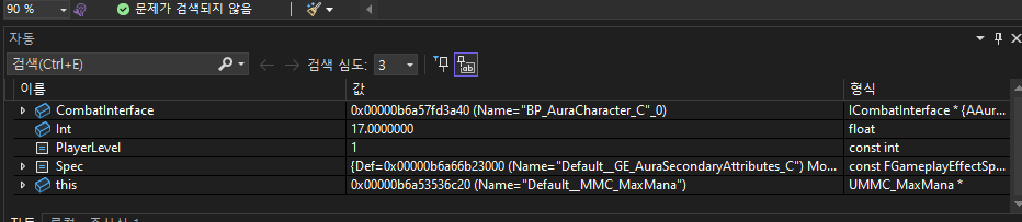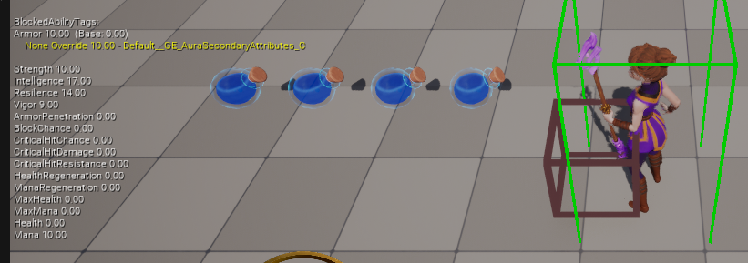 마지막으로 BP_AuraCharacter 를 열고, DefaultPrimaryAttributes 에 생성한 GE_AuraPrimaryAttributes 를 추가해준 다음 실행하면 값이 초기화된 것을 확인할 수 있다.
