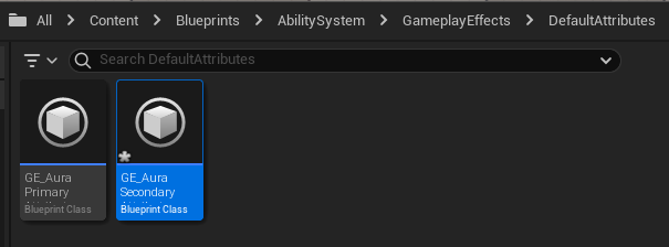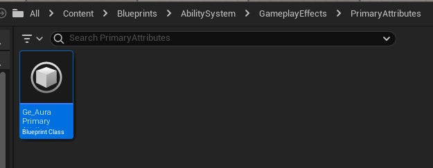 컴파일후 에디터로 돌아와서 GameplayEffect 기반 블루프린트 GE_AuraPrimaryAttributes 를 하나 생성하고