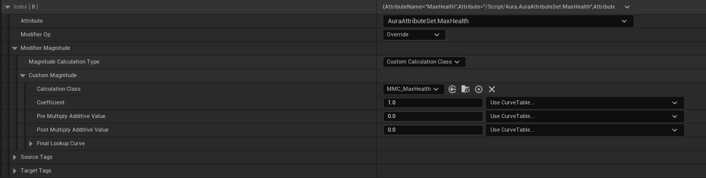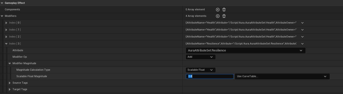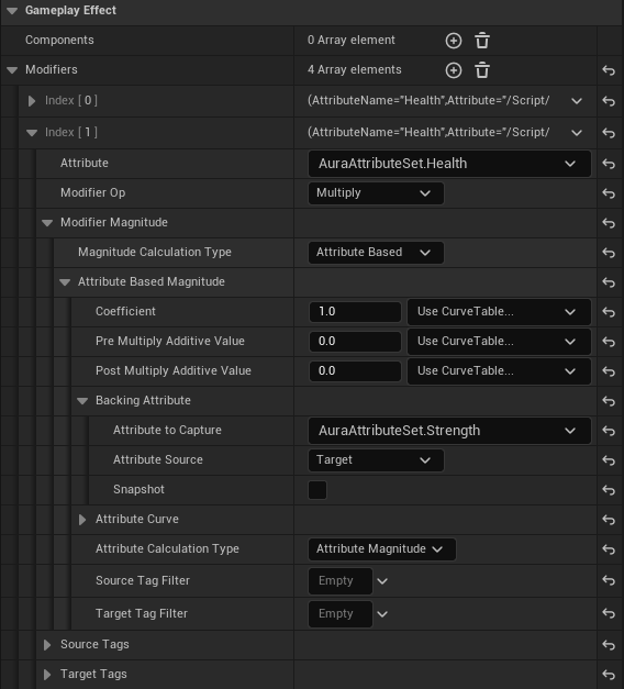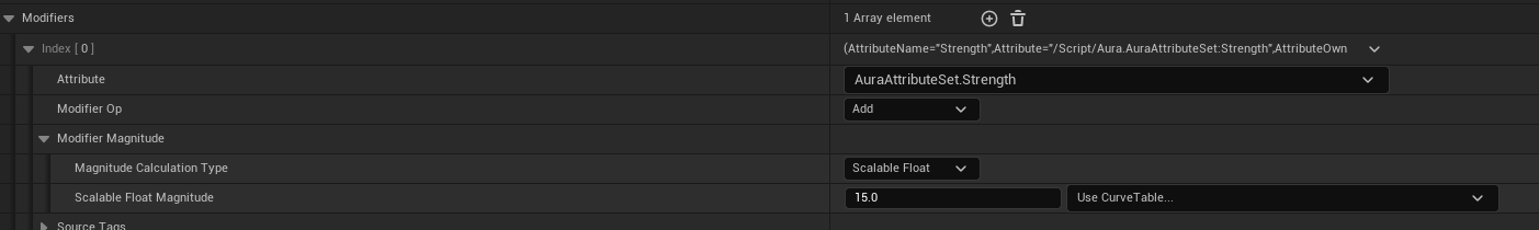 Modifiers 를 하나 더 추가하고, 이번에는 AuraAttributeSet.Strength 의 값을 더하도록 설정한다.