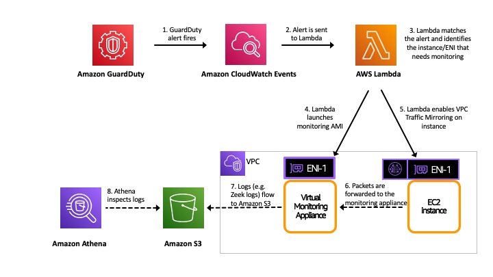 - AWS Lambda가 Virtual Monitoring Appliance 를 실행시켜 VPC 트래픽 미러링 세션을 만든다