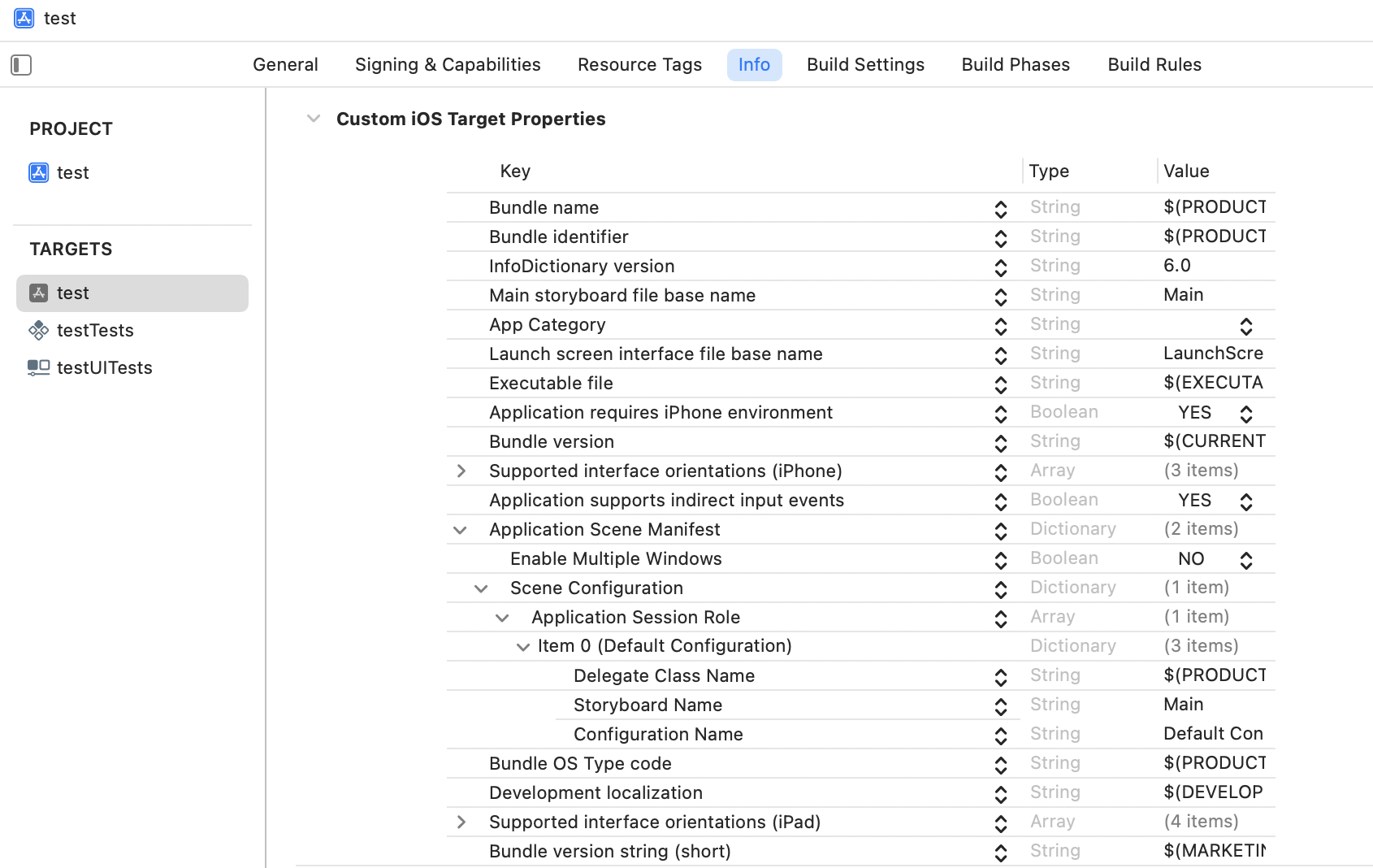 - Info : Info.plist 값, 지원되는 문서타입, 로컬라이제이션 등을 포함하여 프로젝트나 타겟의 속성을 편집.