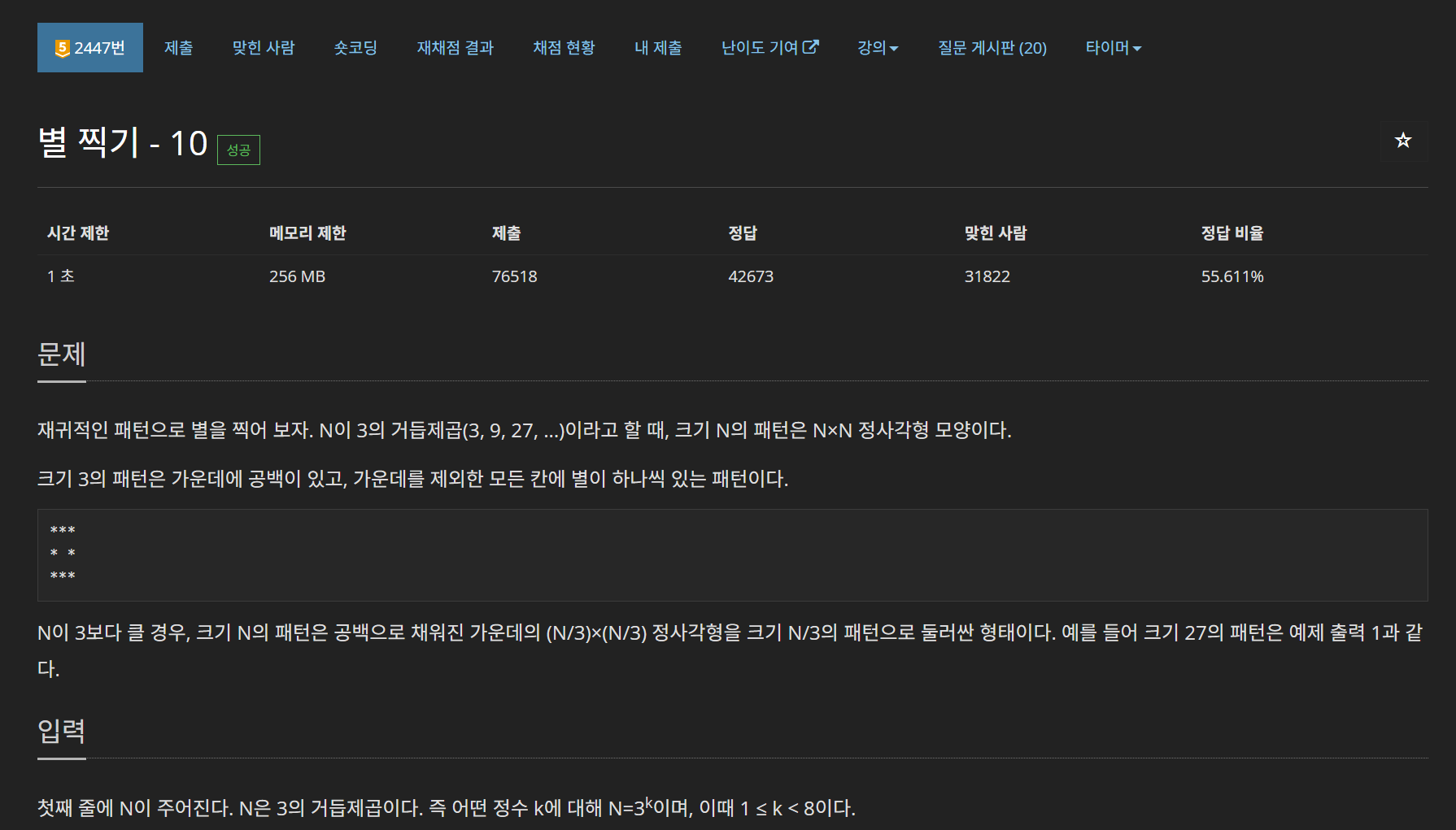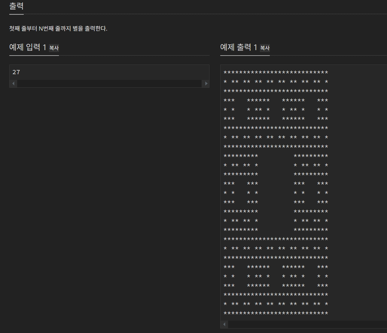 1/3 씩 반복해서 재귀문도 돌려야하고, 값을 찍어내기도 해야하는데, 중간중간 비워두기까지 해야한다..