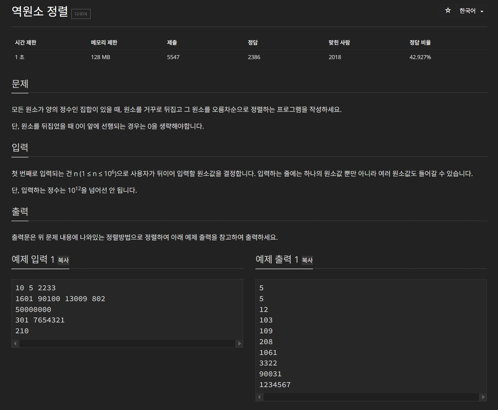 이 문제는 값을 받을 때마다 뒤집은 다음 해당 원소들을 오름차순으로 정렬하는 문제이다. 이번 문제도 이전 문제처럼 우선순위 큐를 이용하면 쉽게 정렬되겠다! 라고 생각했었다.