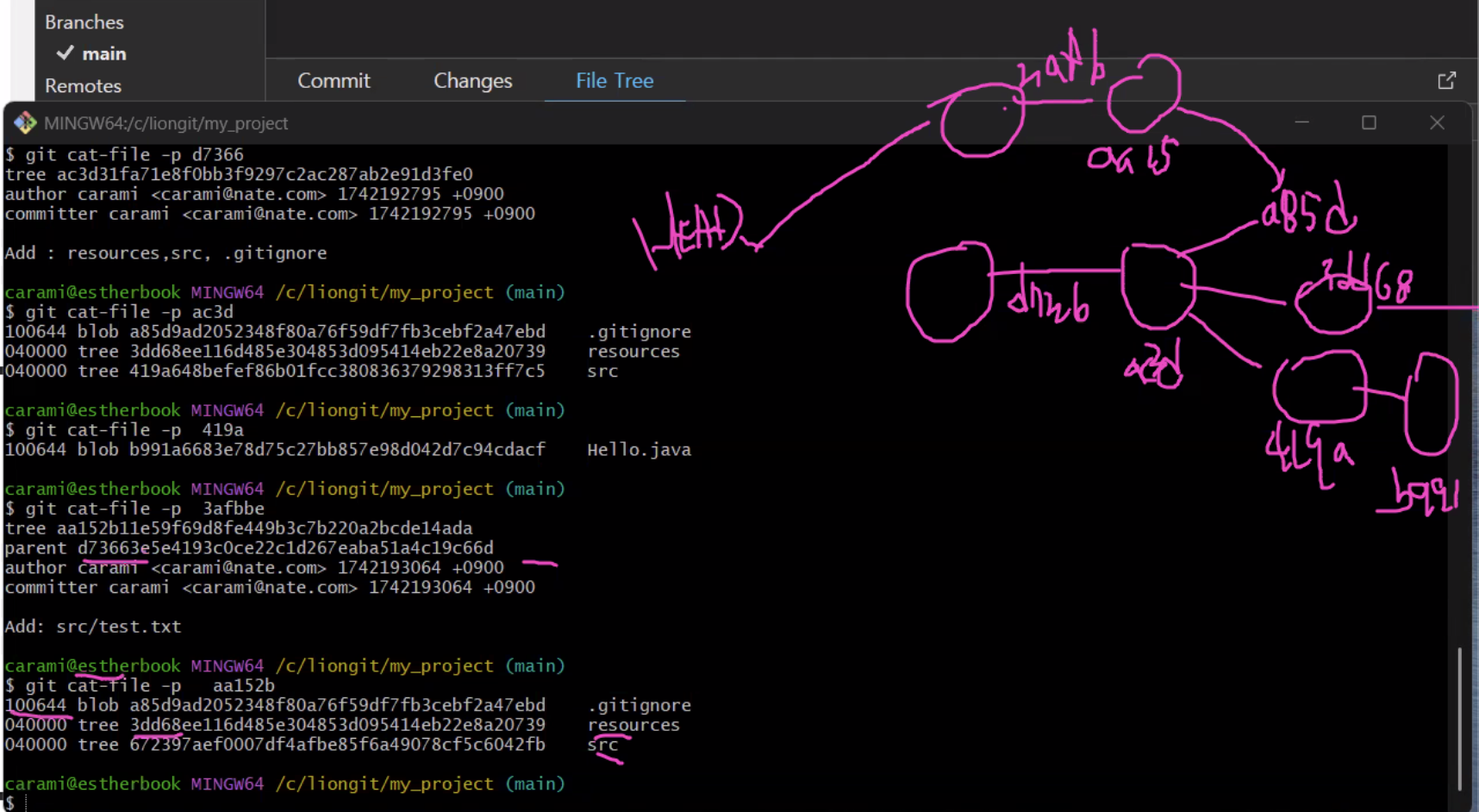 git cat-file -p 깃저장소에서 어떻게 저장되어있는지 확인해주는