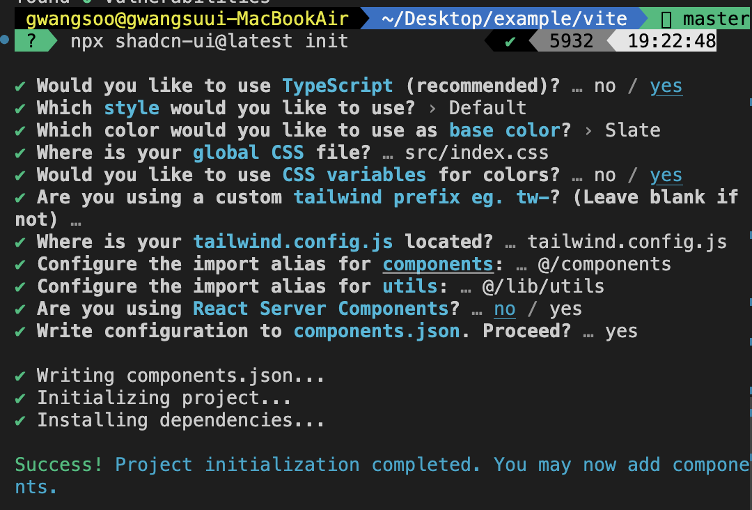 3. 만약 npx shadcn-ui@latest add만 했다면 프롬프트에 가져올 수 있는 모든 컴포넌트에 대한 정보들이 나온다. 그리고 조작을 통해 선택한 컴포넌트들이 selectedComponents로 재할당이 된다.