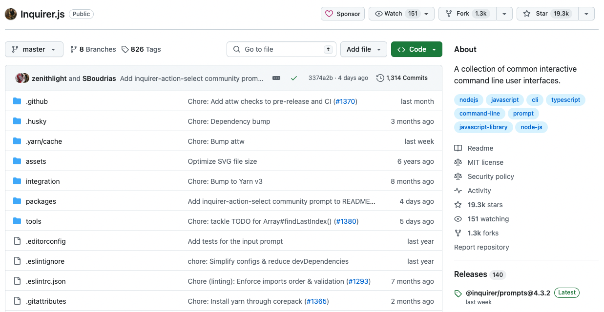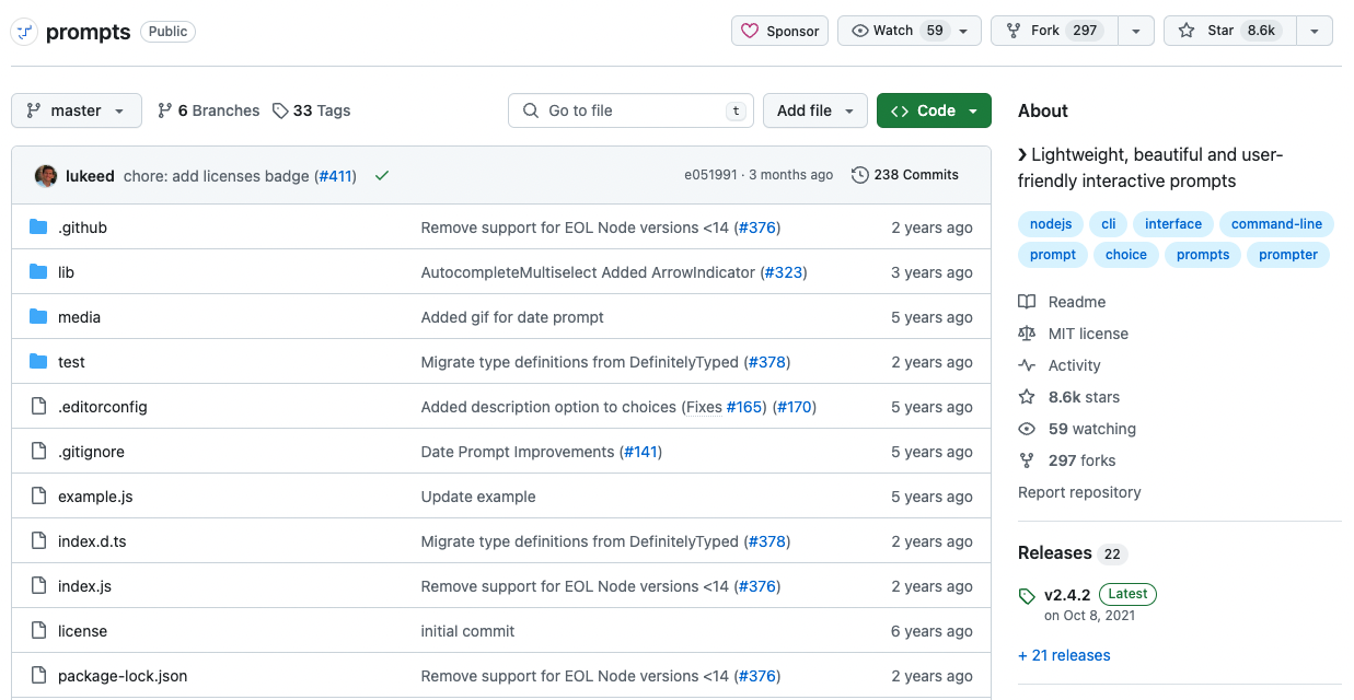 shadcn ui에서는 사용자와 상호작용이 필요할 때 prompts를 사용했다. 때문에 이를 사용하려고 했지만 @inquirer/prompts라는 라이브러리를 찾았고, 유지 보수가 되고 있다는 점, 사람들이 관심을 많이 가지고 있다는 점에서 해당 라이브러리를 선택했다.