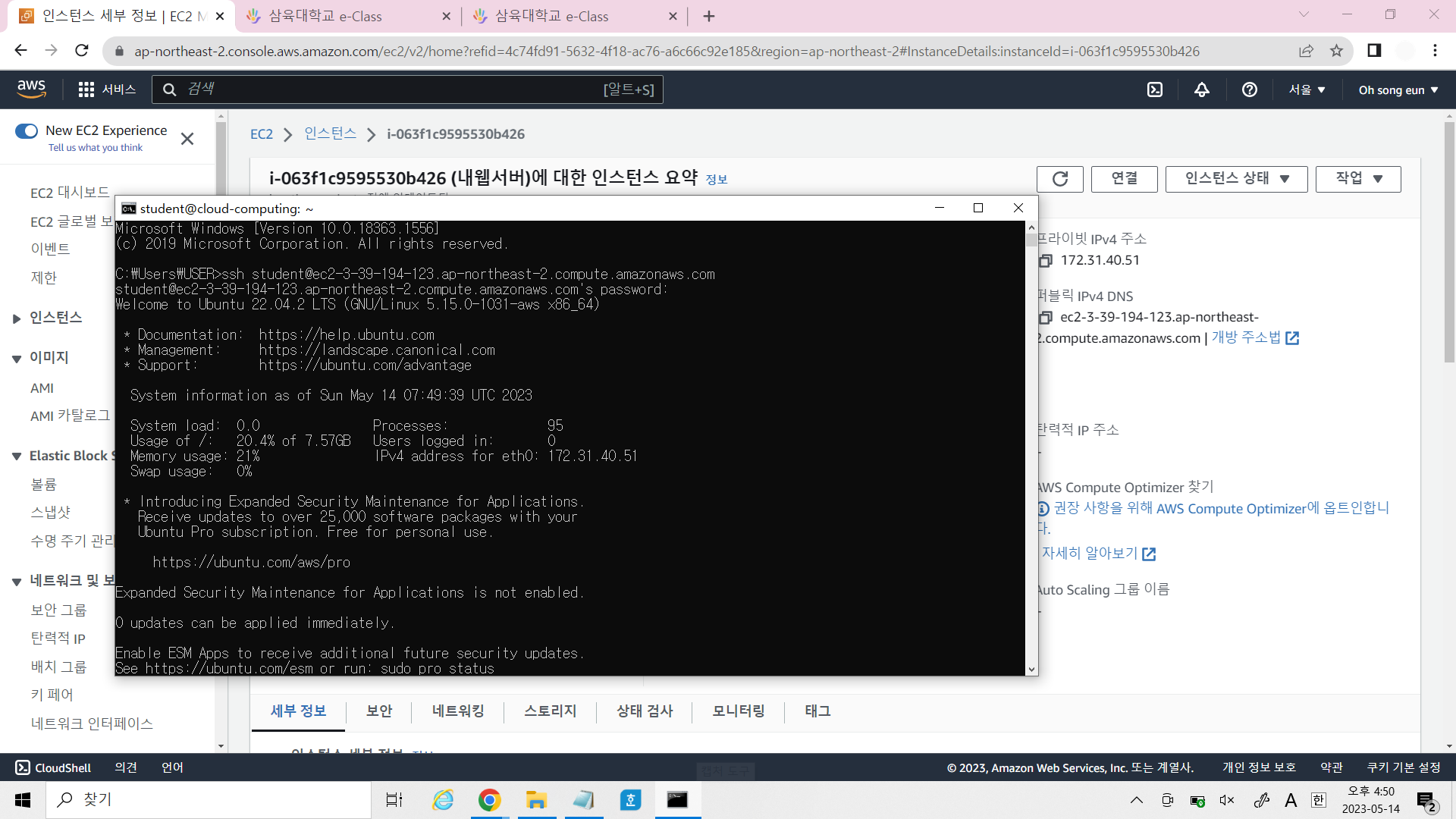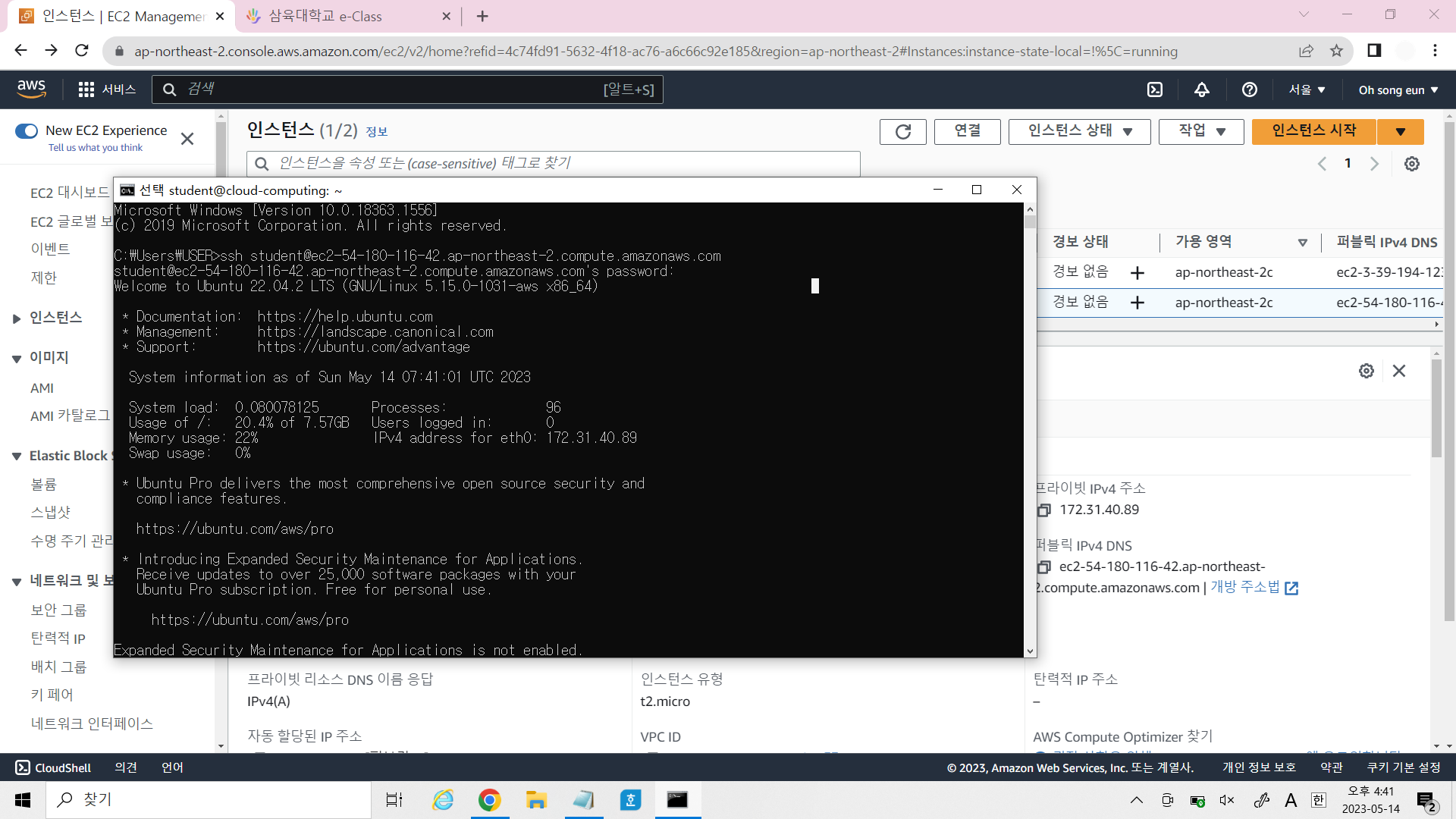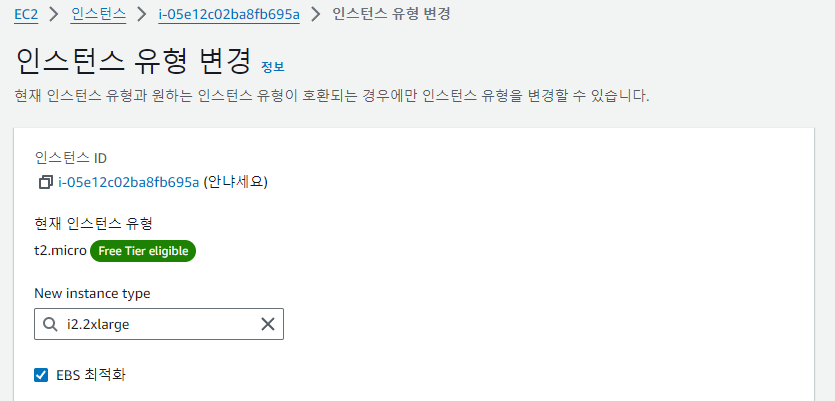 기존 인스턴스 = 인스턴스 중지 → 작업 → 인스턴스 설정 → 인스턴스 유형 변경