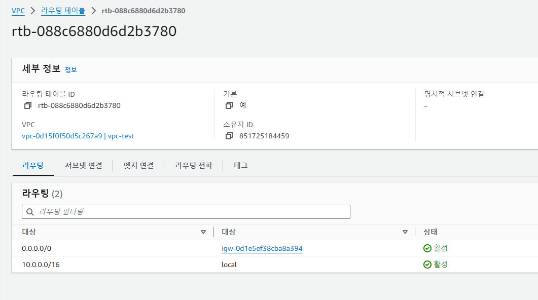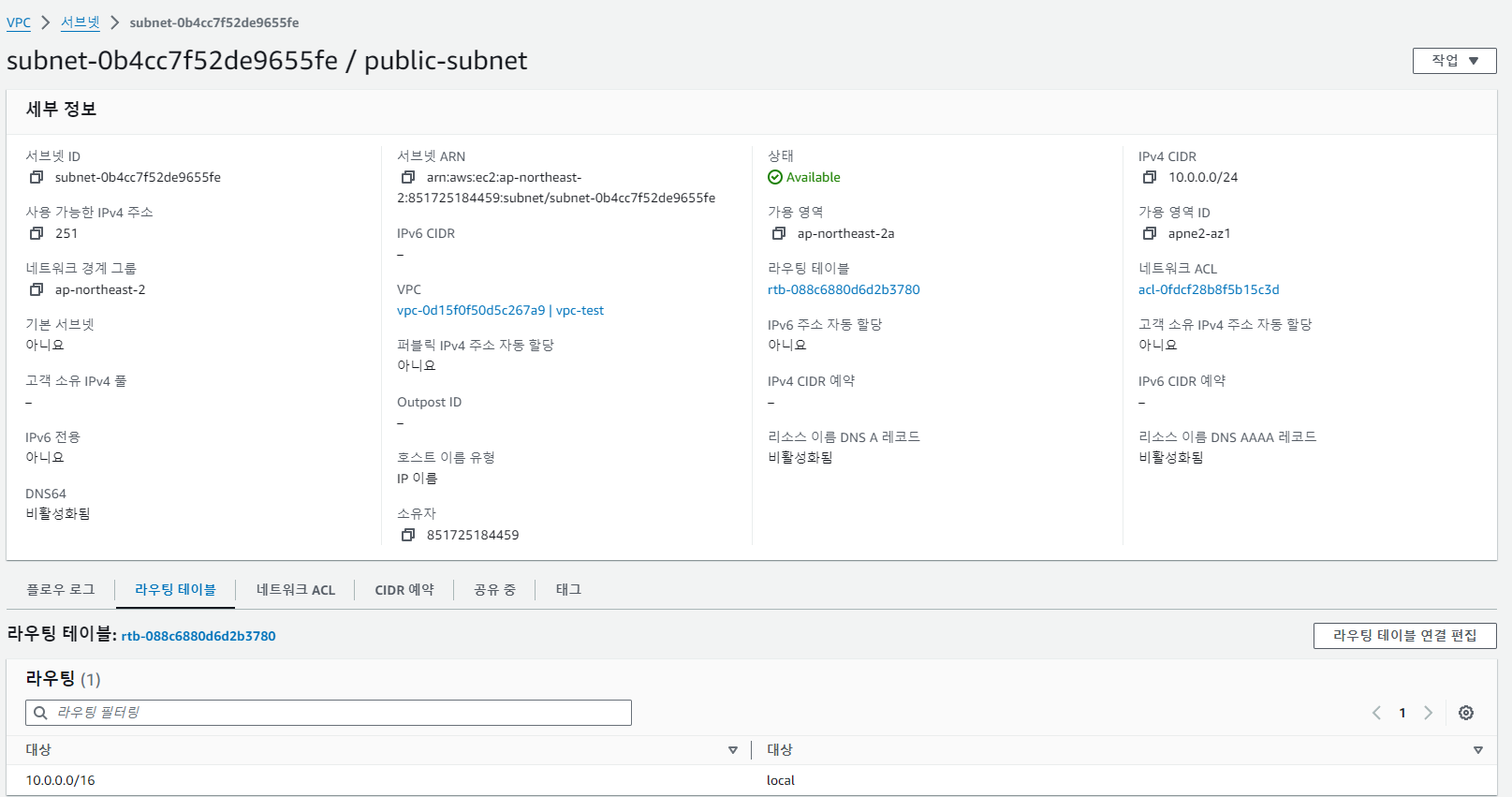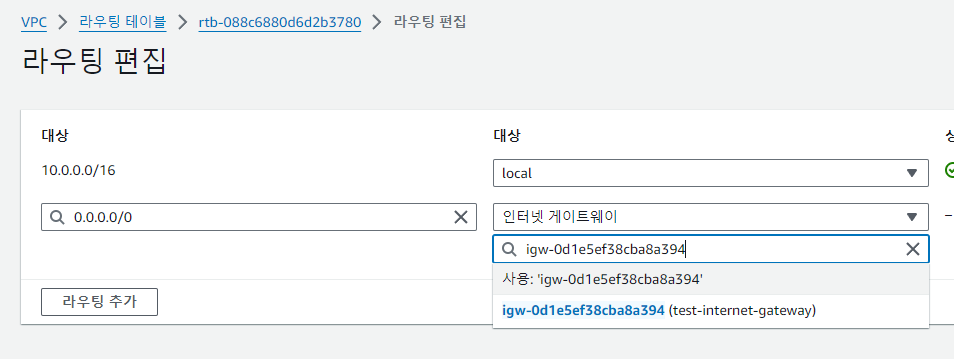 Public 서브넷의 라우팅 편집 - 모든 트래픽 (0.0.0.0/0)이 인터넷 게이트웨이로 가도록