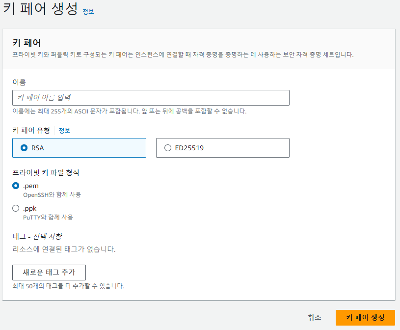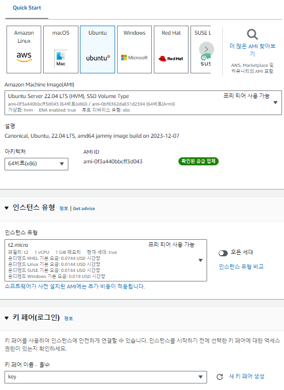 검색창에서 EC2검색 → 인스턴스 시작 → 이름 설정→ Ubuntu → ami 설정 → 인스턴스 유형 설정 → 키 페어 설정
