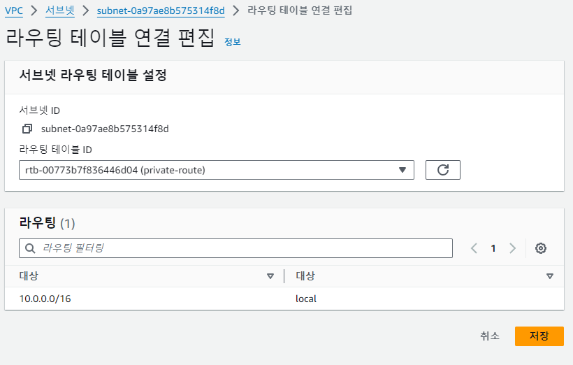 라우팅 테이블 연결 편집 - 생성한 Private 서브넷의 라우팅 테이블을 private subnet으로 연결