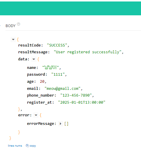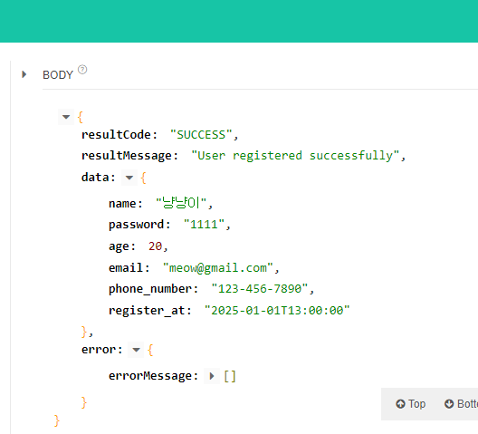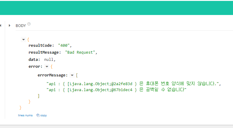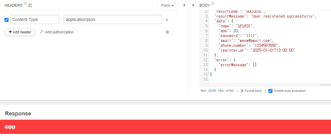 이번엔 에러가 내려왔다. 다시 정확한 규격대로 해보면