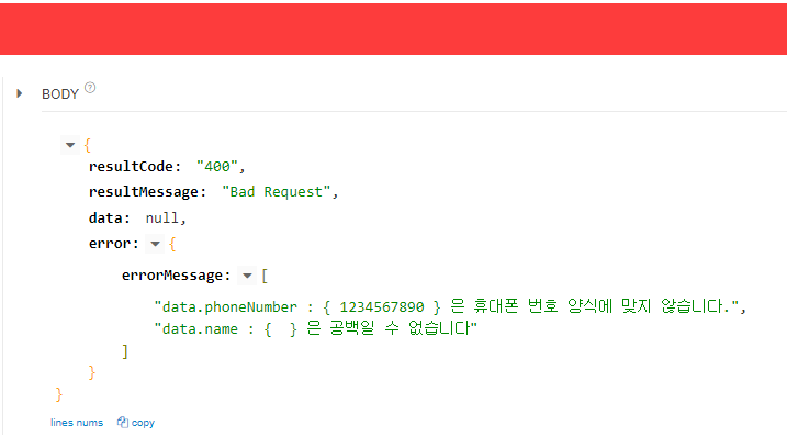 지금까지 했던 내용은 서버에서는 MethodArgumentNotValidException 이 발생되어 확인할 수 있지만,