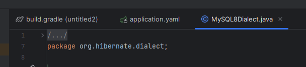shift를 두 번 누르고 Mysql8Dialect를 클릭하고 위에있는 org.hibernate.dialect를 붙이고 .MySQL8Direct를 붙여준다.