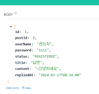 POST로 http://localhost:8080/api/reply 에