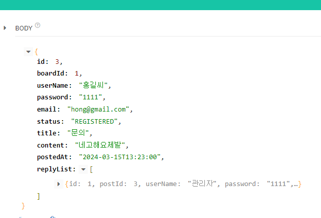 로 글을 조회하면 답글까지 정보가 나온다.