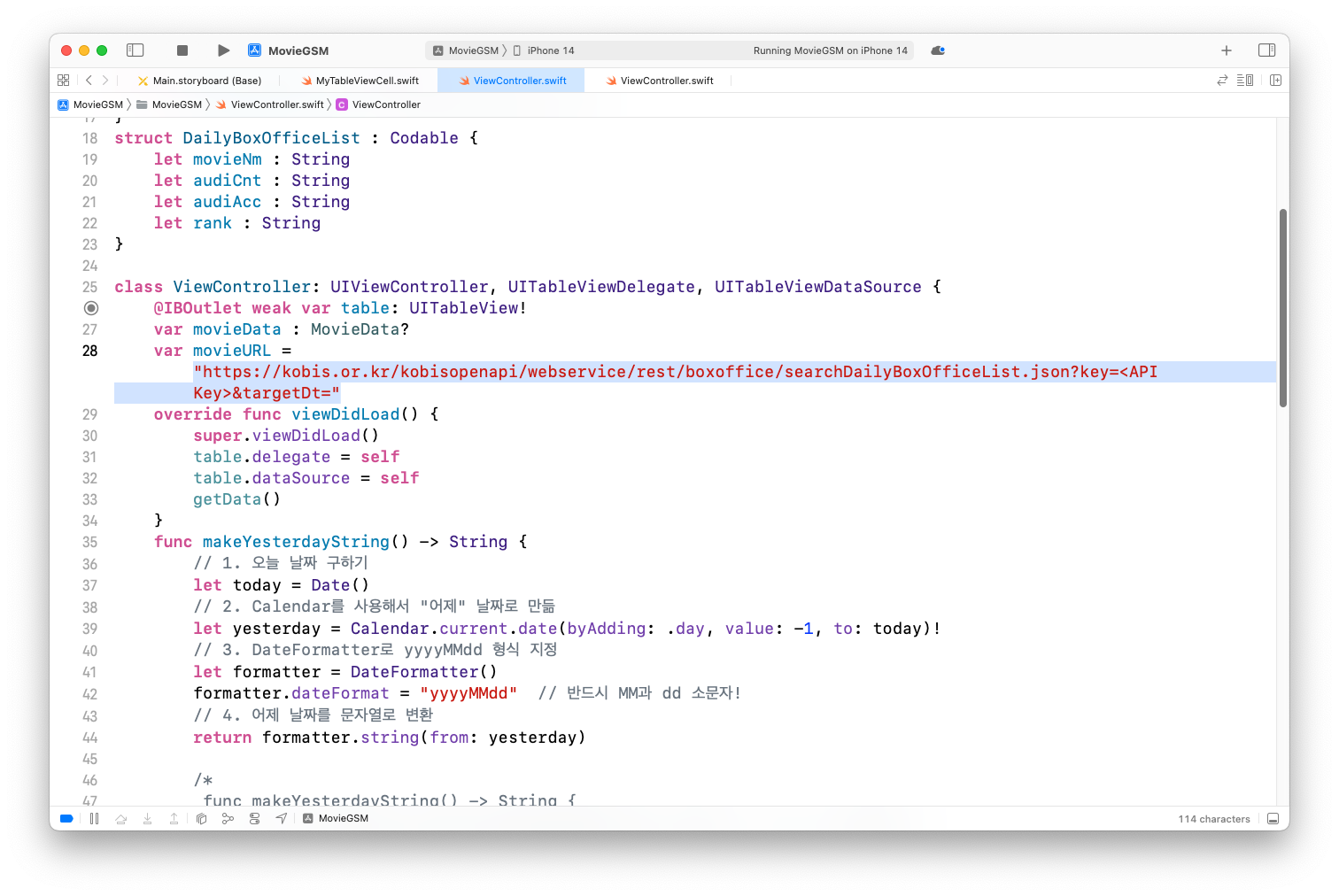 var movieURL = "https://kobis.or.kr/kobisopenapi/webservice/rest/boxoffice/searchDailyBoxOfficeList.json?key=<API Key>&targetDt="