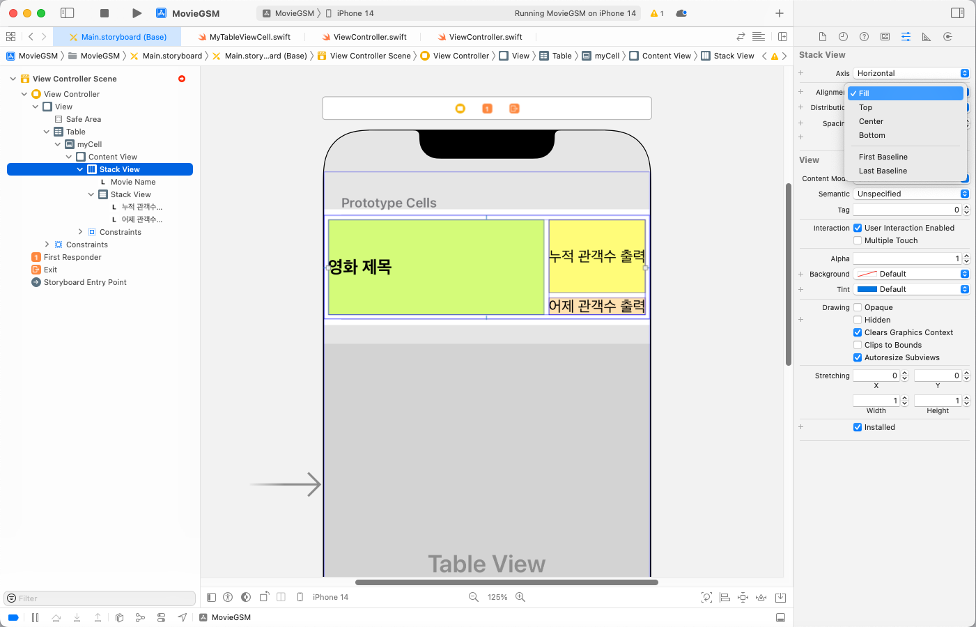 최상위 Stack View 선택 후 Alignment를 Fill로 변경