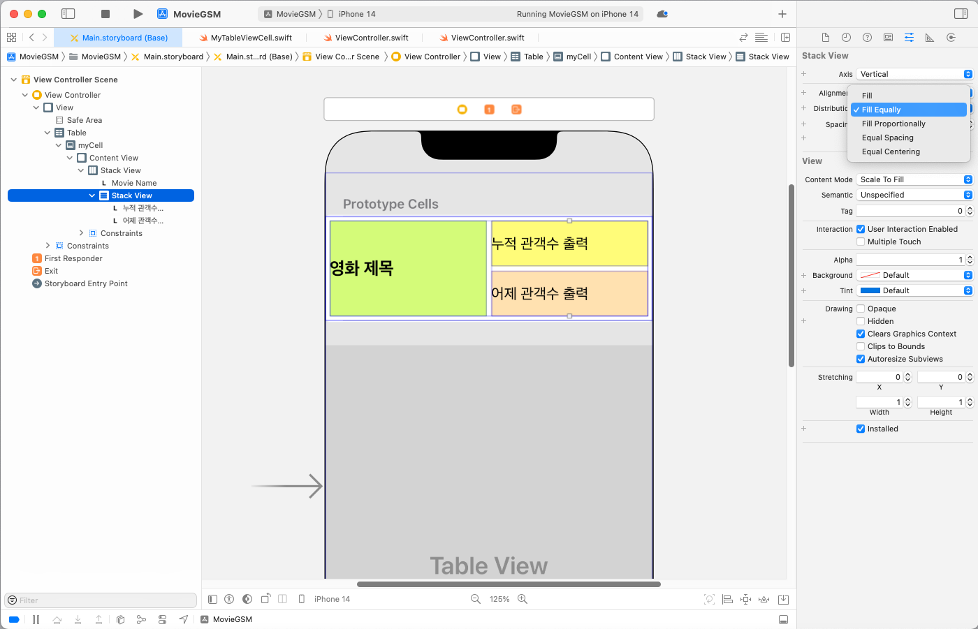 2개의 Stack View 모두 Distribution을 Fill Equally로 변경