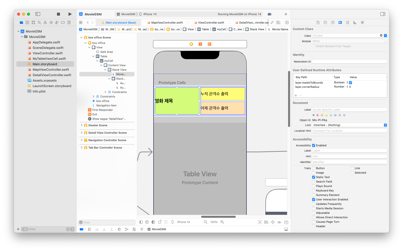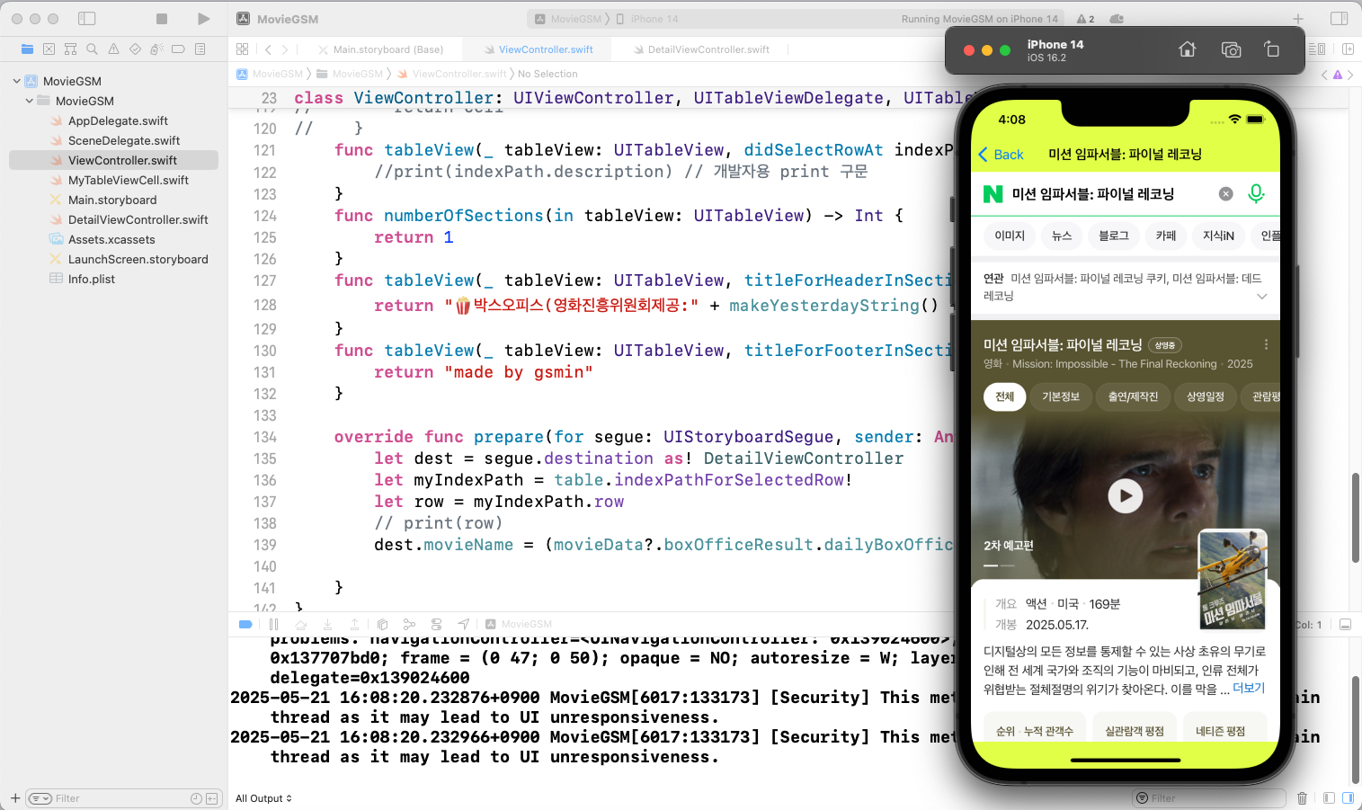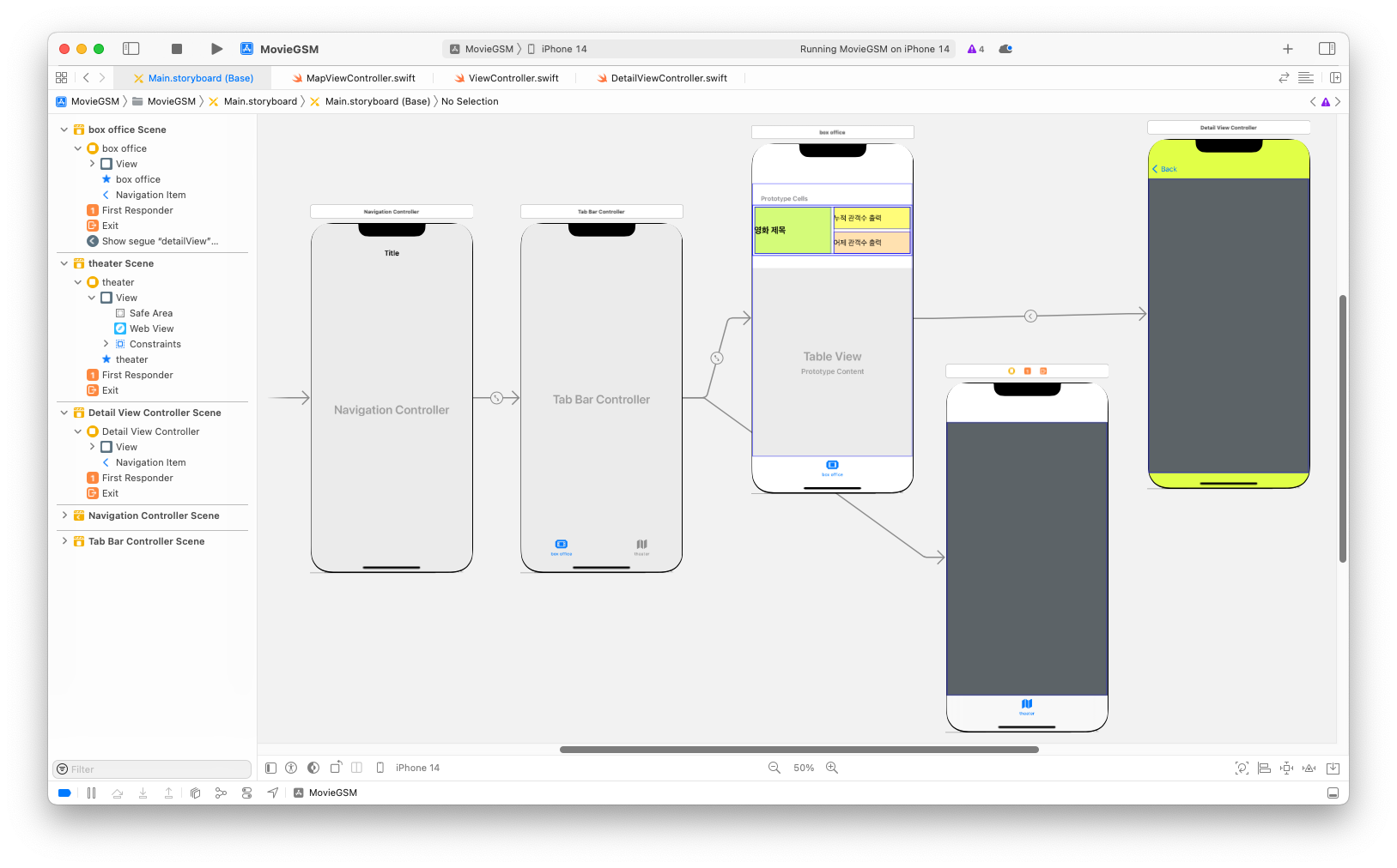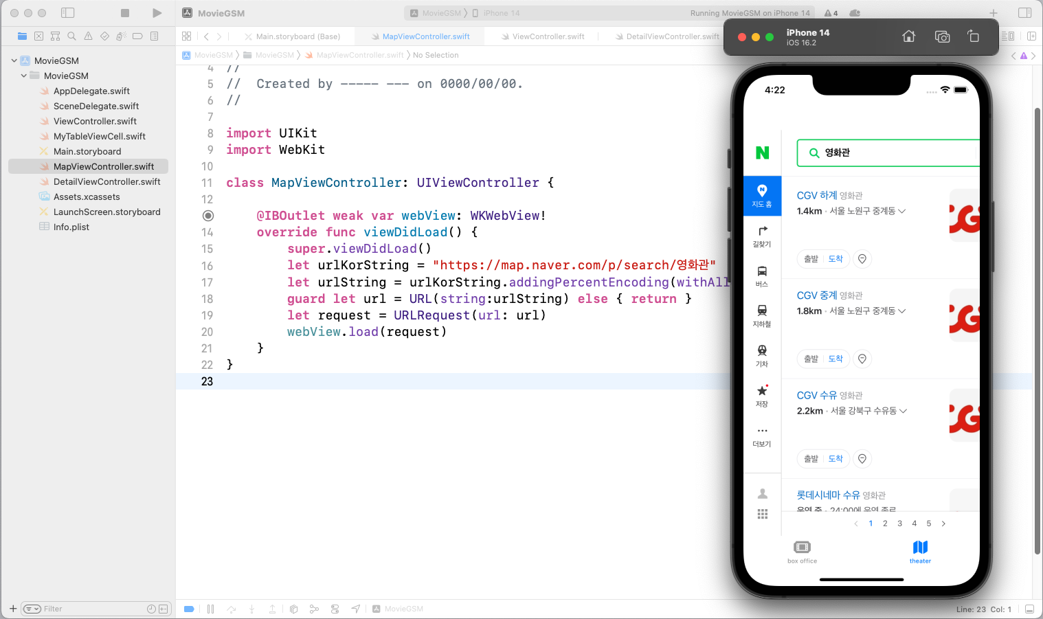 MovieModels.swift, MovieService.swiftStoryboard, MyTableViewCell.swiftViewController.swift, DetailViewController.swift, MapViewController.swift이렇게 하면 네트워크 로직의 재활용성이 높아지고(다른 뷰 컨트롤러에서도 호출 가능),