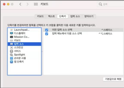 위 사진과 같이 '환경설정 > 키보드 > 단축키 > 입력소스'로 이동해서