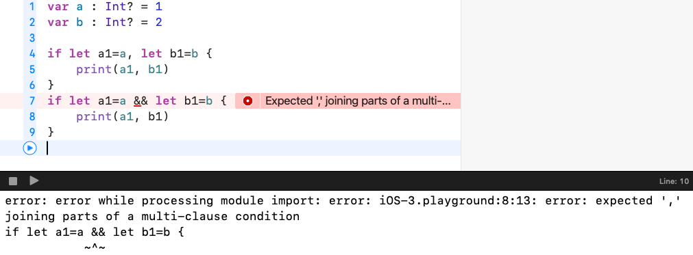이렇게 조건나열을 통해서는 옵셔널을 벗길 수 있지만, && 연산자를 통해서는 옵셔널을 벗길 수 없다는 오류가 표시돼요.