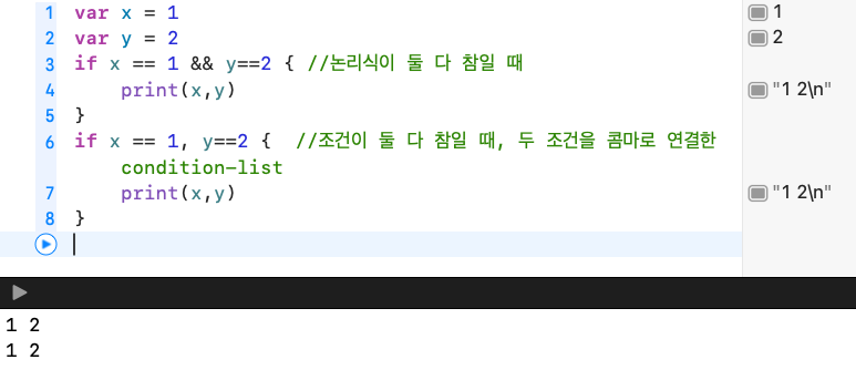 그러면 어떤 차이 때문에 && 연산과 조건 나열을 나누는지 확인해볼게요.