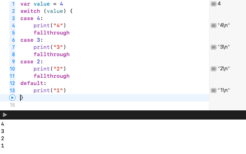 추가로 case별로 빠져나가지 않고 아래로 계속 내려가게 하려면 fallthrough문을 사용하면 돼요.