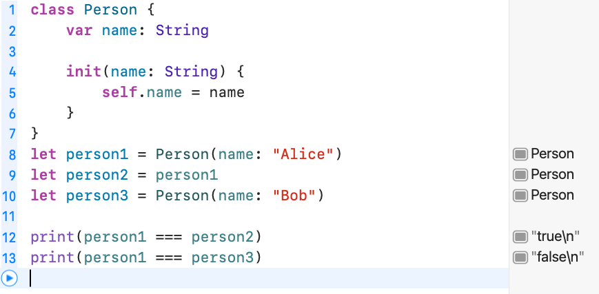 연산자는 참조 타입(클래스)의 두 인스턴스가 동일한 객체를 참조하는 지 비교해요.