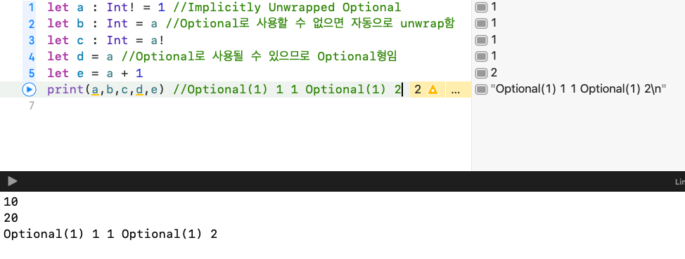 을 사용한 변수는 그냥 출력 시 경고문구와 함께 출력은 Optional( 값 )