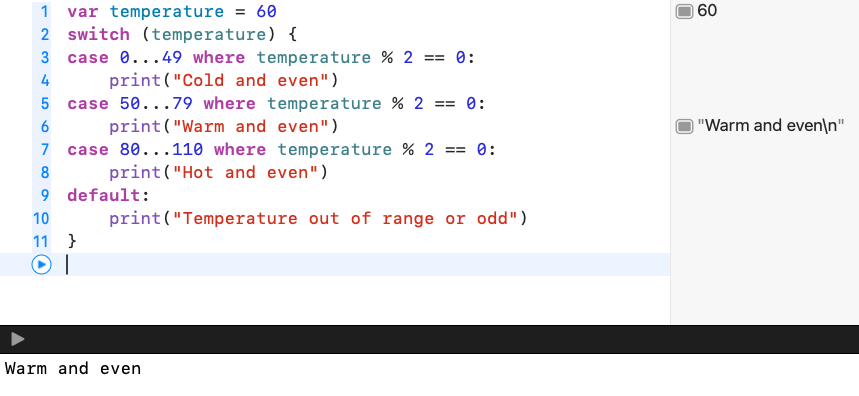 또한, switch문에서 각 case는 where절을 사용할 수 있어요. where절은 부가적인 조건을 추가하기 위하여 사용해요.