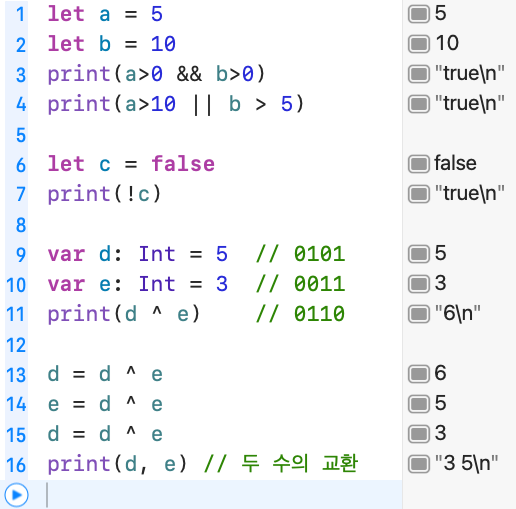 변수 없이 논리 연산자를 통해 두 수를 교환할 수 있다는 것은 신기하네요.